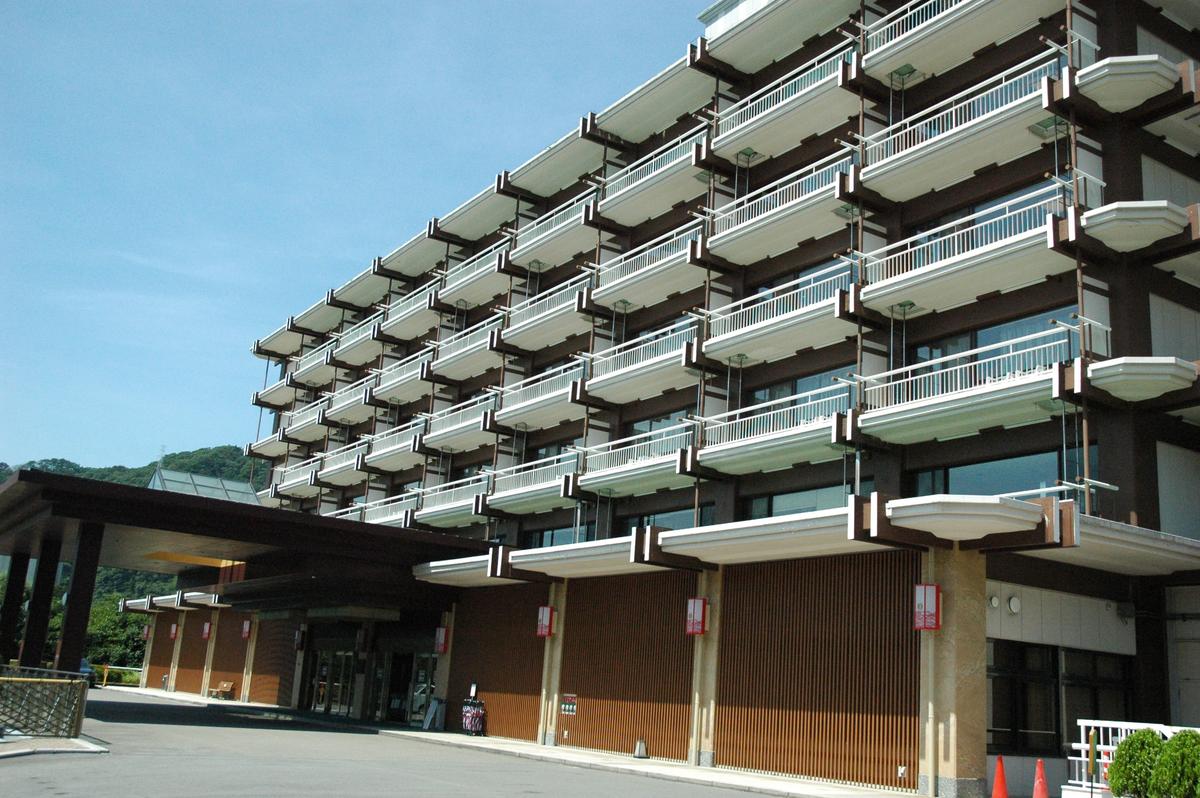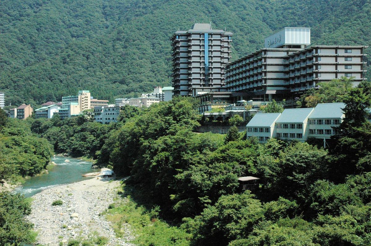次の写真は、ホテルの遠景です。写真の中央から右手に見える大きな建物です。鬼怒川に面して立地しております。
