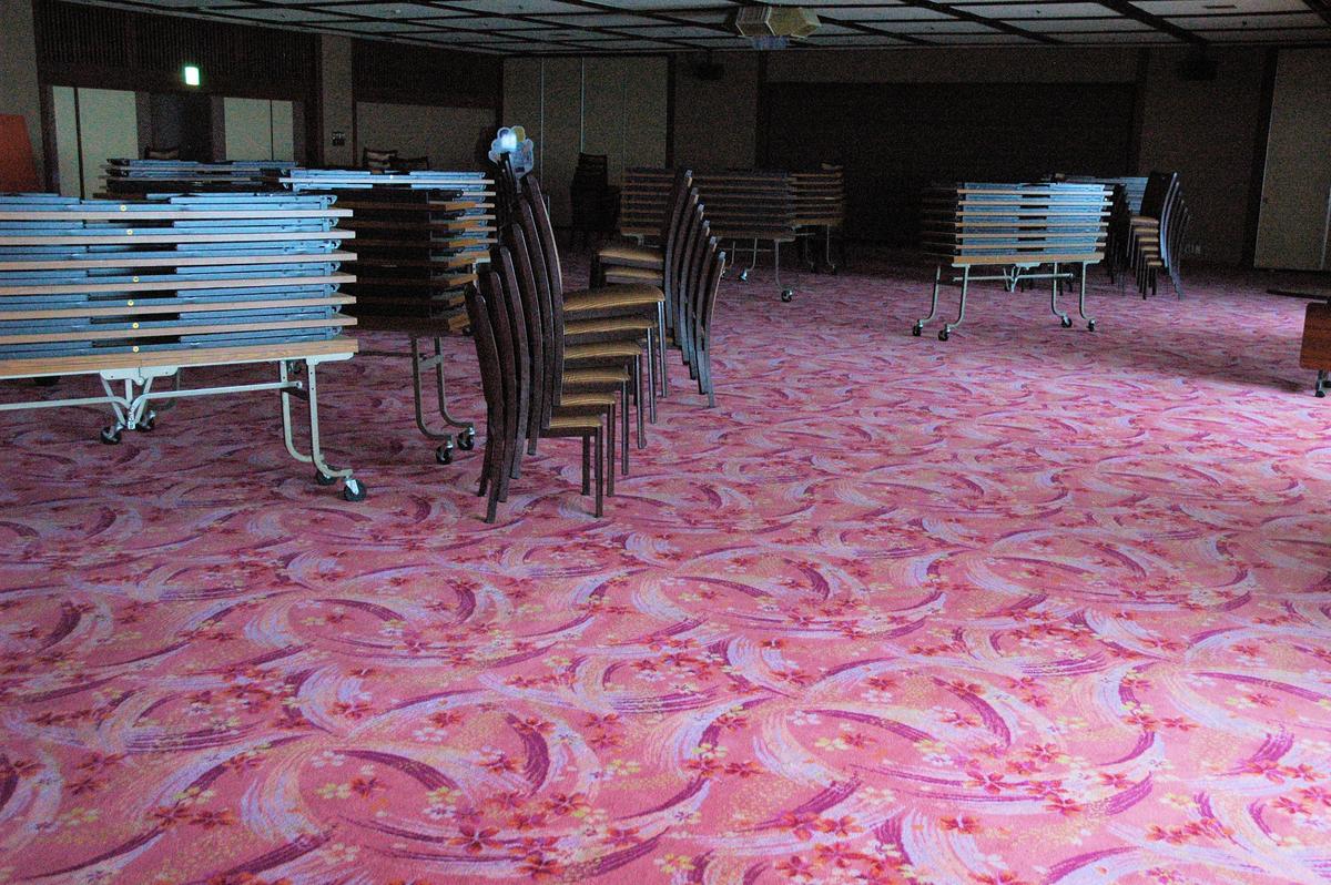 食事は、大広間で一斉にとることになります。感染症防止のため、バイキング式ではなく生徒一人一人に配膳されることとなります。写真は、食事会場となる広間です。大人数が一堂に集まるのに十分な広さを有していることを確認しました。また、ここでは入所式や退所式等も行います(玄関ロビーでは行いません)。