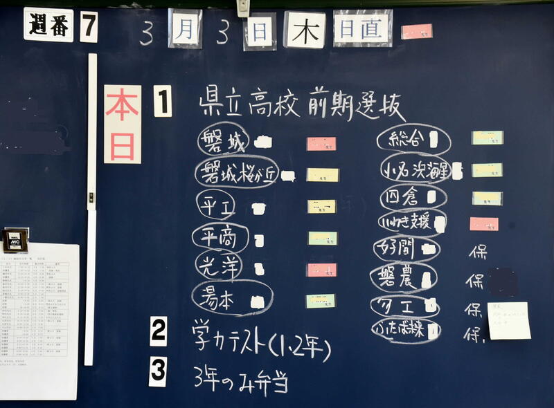本日(3月3日(木))、県立高等学校の前期選抜第1日の試験が行われています。3年生の受験者は、今、試験問題と格闘しております。持てる力をしっかりと発揮してくれるものと思います。
