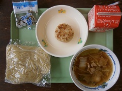 2017年10月11日 12時21分あんかけラーメン(中華ソフトめん+あんかけスープ)、牛乳、いりどうふつつみやき、こざかな です。
