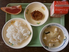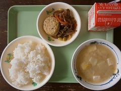 2017年10月2日 12時15分ごはん、牛乳、やさいいりとりつくね、こんにゃくのきんぴら、ご汁 です。