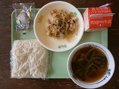 2017年10月4日 12時09分かけうどん(ソフトめん+かけ汁)、牛乳、キャベツとツナのにびたし、