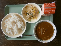 2017年6月22日 12時45分チキンカレーライス(むぎごはん)、牛乳、ツナとやさいのソテー です。