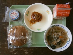 2017年6月23日 12時13分バーガーパン、牛乳、ハンバーグ(デミグラスソース)、はるさめともやしのスープ、