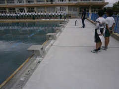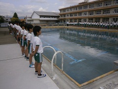今日は、6年生が参加しての「プール開き」が行われました。プールサイドに並んで、係の先生等からの話を聞きました。これから各学年ごとにプール開きを行い、プールでの学習が始まります。