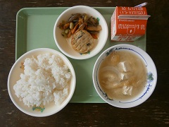 2017年6月15日 12時26分ごはん、牛乳、やさいいりとりつくね、こんにゃくのきんぴら、新じゃがいもと新たまねぎのみそ汁 です。