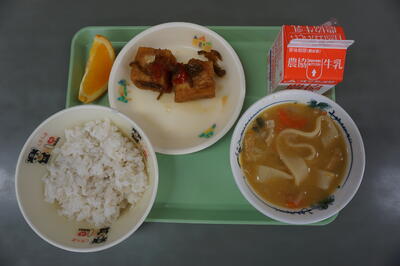 2022年10月19日 12時30分【こんだて】むぎごはん、ほうとう、あげだしどうふ甘酢あんかけ、オレンジ、牛乳です。