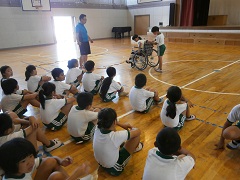 5年生は「ユニバーサルデザイン」について勉強し、車椅子体験や体におもりをつけて動く体験をしました。
