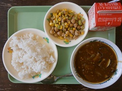2017年7月11日 12時16分なつやさいカレーライス(むぎごはん)、牛乳、ひよこ豆とツナのソテー です。