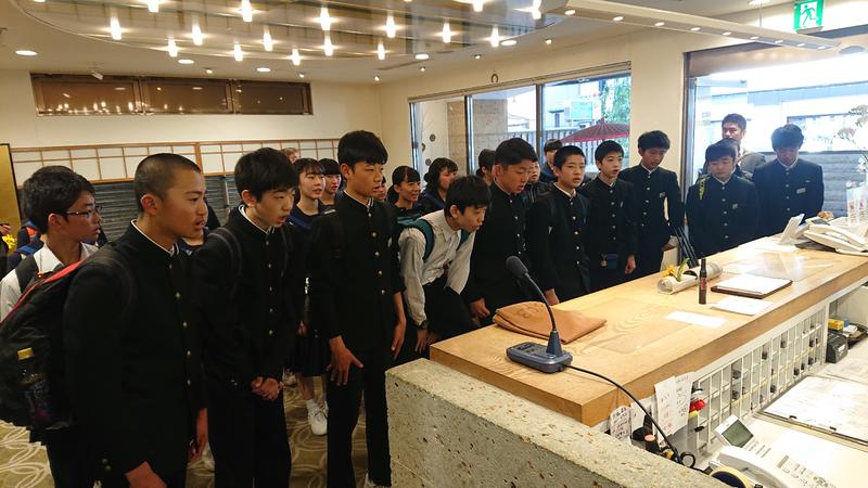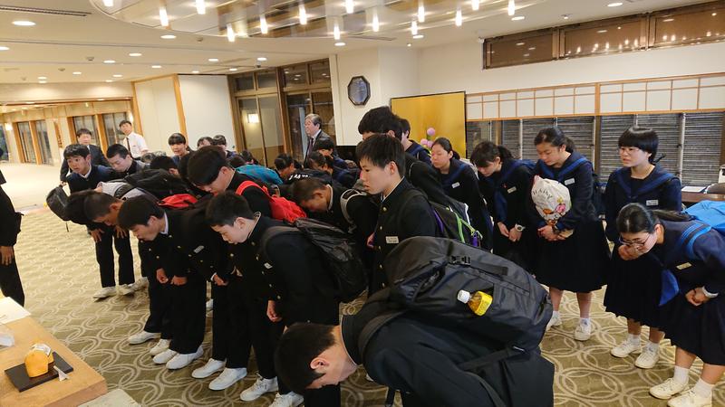 修学旅行レポート~旅館にあいさつ 2019年4月13日 08時53分 前夜遅くまでの活動にも関わらず、全員が時間通りに起床。3日目のクラス別活動に出発する際に、お世話になった金波楼さんにお礼のあいさつをしました。