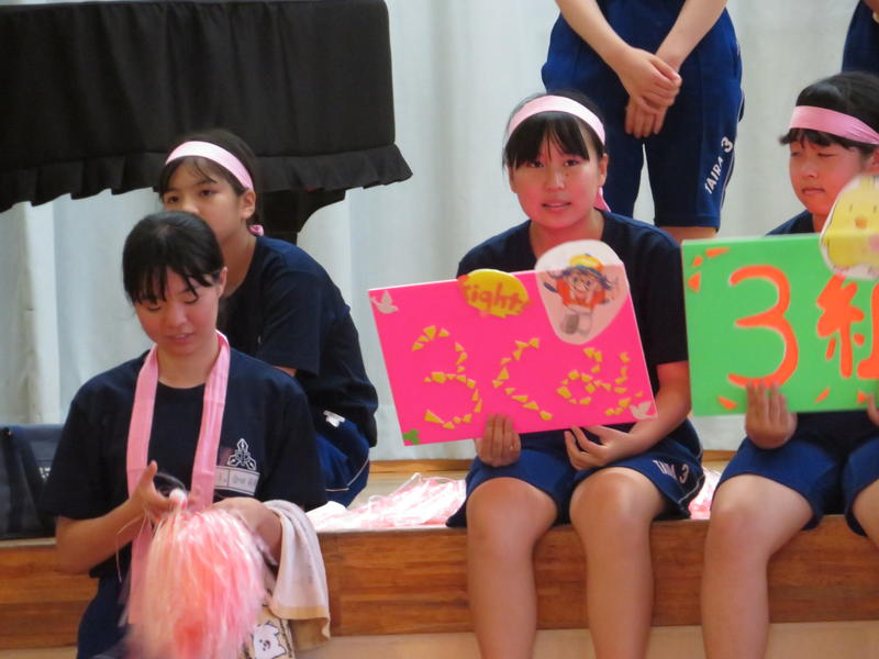 サッカーは前半が女子で後半が男子、バレーボールは第1セットが女子で第2セットが男子、フルセットなら男女混合という形式にしたため、自然に応援にも熱が入ります。さらに、この企画が決定してからそれほど日がなかったにもかかわらず、どのクラスも「いつ作ったの?」と思うような応援グッズが・・。子どもたちのスポーツフェスティバルへの期待と思い入れが感じられます。