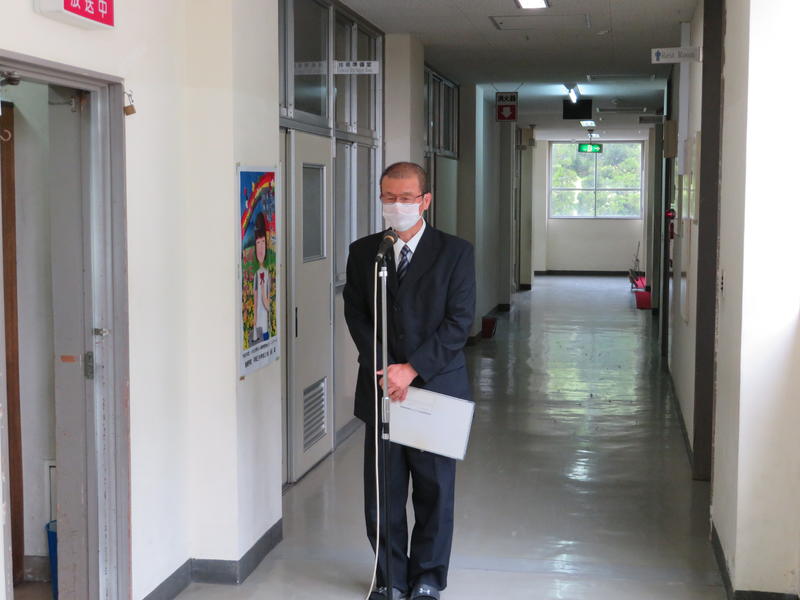 2020年6月1日 12時58分約1ヶ月半ぶりに全生徒が顔をそろえて、通常の学校生活が再開されました。朝の放送朝会において、校長、生徒指導主事、養護教諭から、新しい生活様式を含めた感染症対策、学校再開における留意事項、心身の健康と相談についてなど、講話や指導を行い1日がスタートしました。
