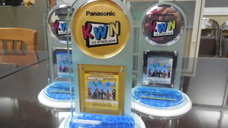 2021年3月20日 00時05分表彰式の日に生徒たちが手にしていたトロフィー。「ベスト未来探究賞」「パナソニック社員賞」そして「最優秀作品賞」の3つですが、実はその他にもたくさんの副賞をいただき、それらが学校に送られてきました。