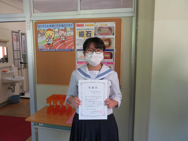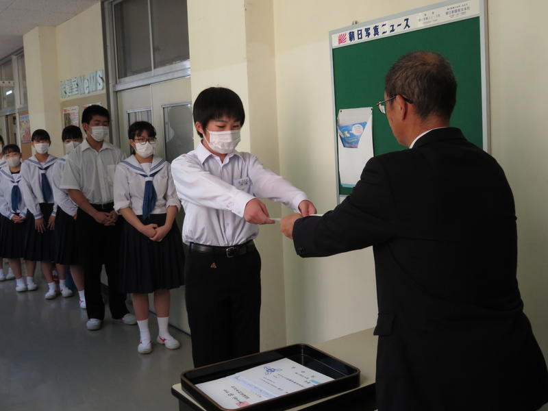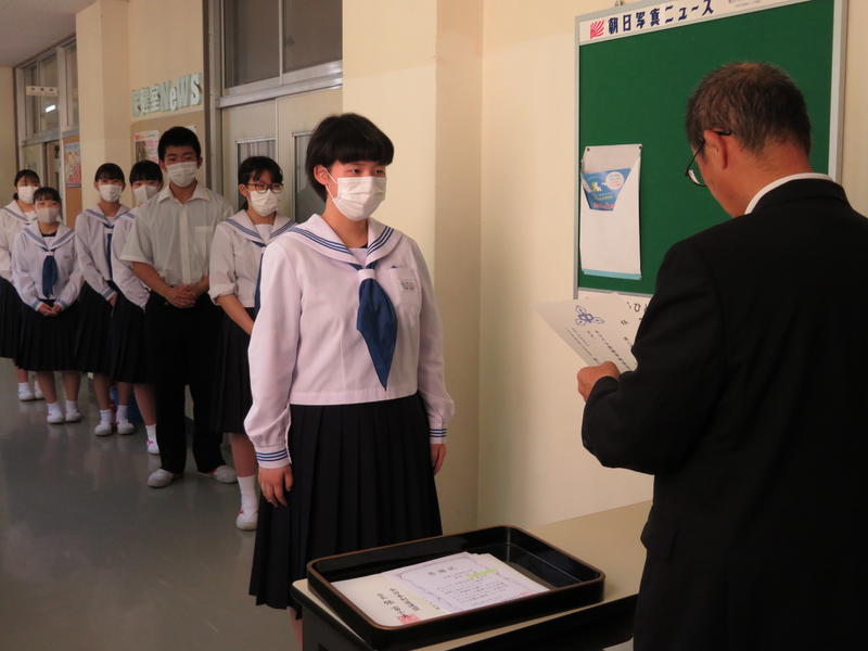 同様にこれまでできなかった表彰状等の伝達を行いました。令和元年度青少年ボランティアの感謝状をいただいた生徒、剣道段位審査において二段、初段に昇段したみなさんです。おめでとうございます。今後の、さらなる活躍を期待します。