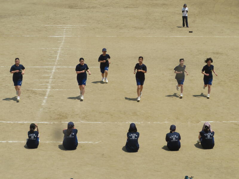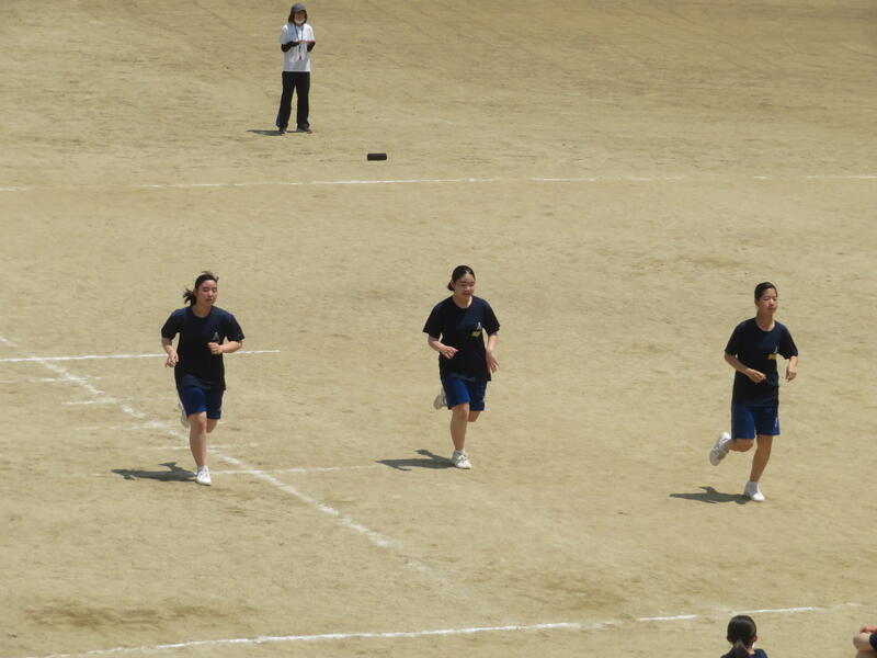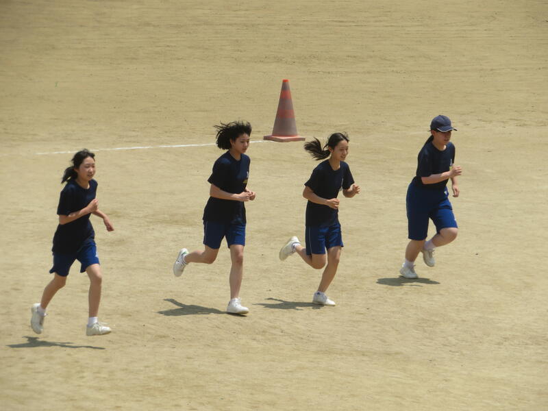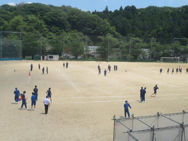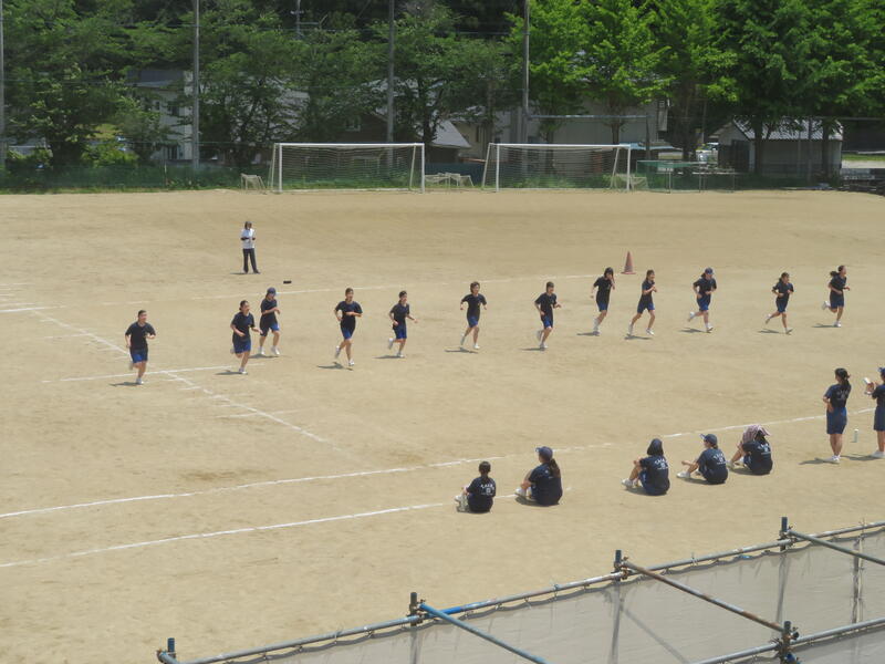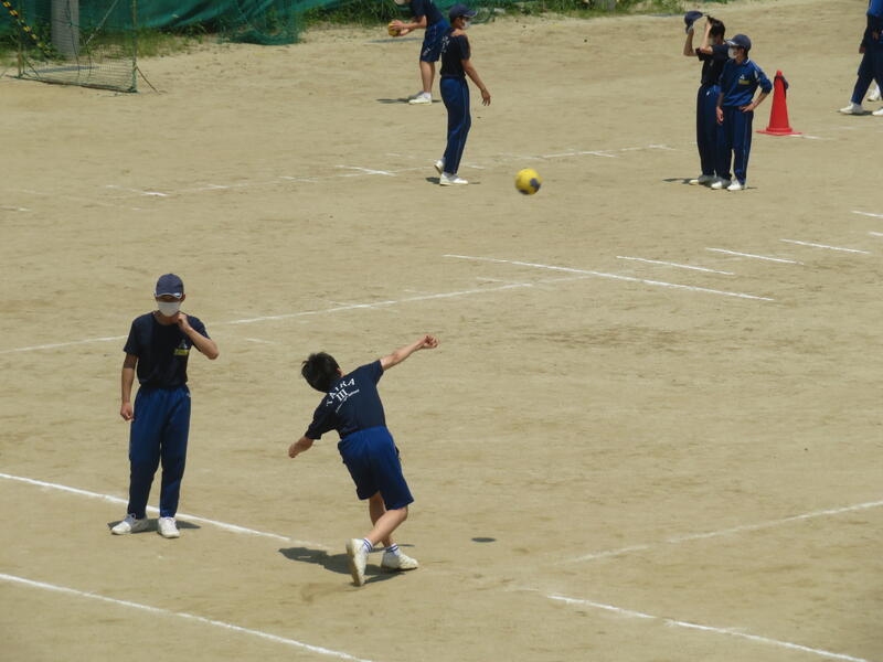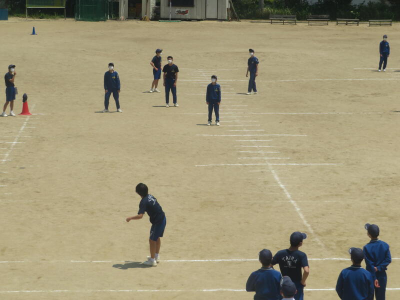 2022年5月25日 12時20分2階東の渡り廊下から校庭を見てみると、体育の授業でボール投げとシャトルランを実施していました。
