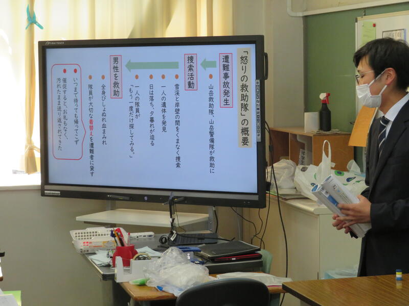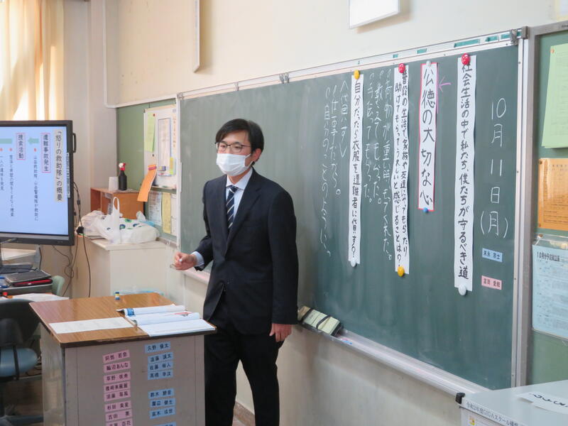 今日は、2年5組で道徳の研究授業が行われました。学習指導案を作成するのも、生徒に対して道徳の授業を行うのもはじめての経験です。主題は「公徳を大切にする心」で、「怒りの救助活動」という教材で授業を行いました。かなり緊張したことと思いますが、落ち着いて授業を進めることができました。
