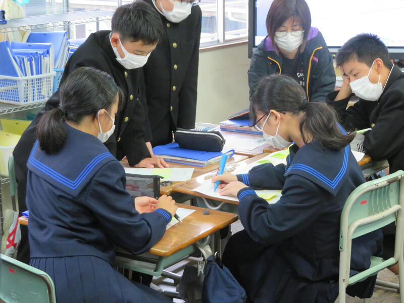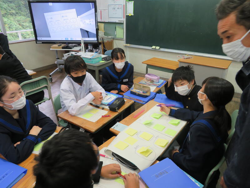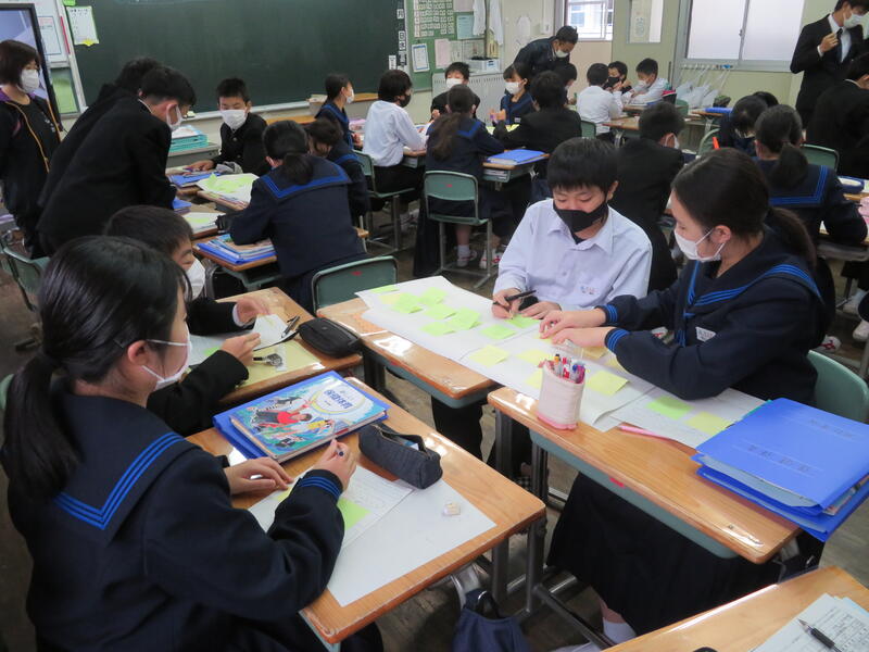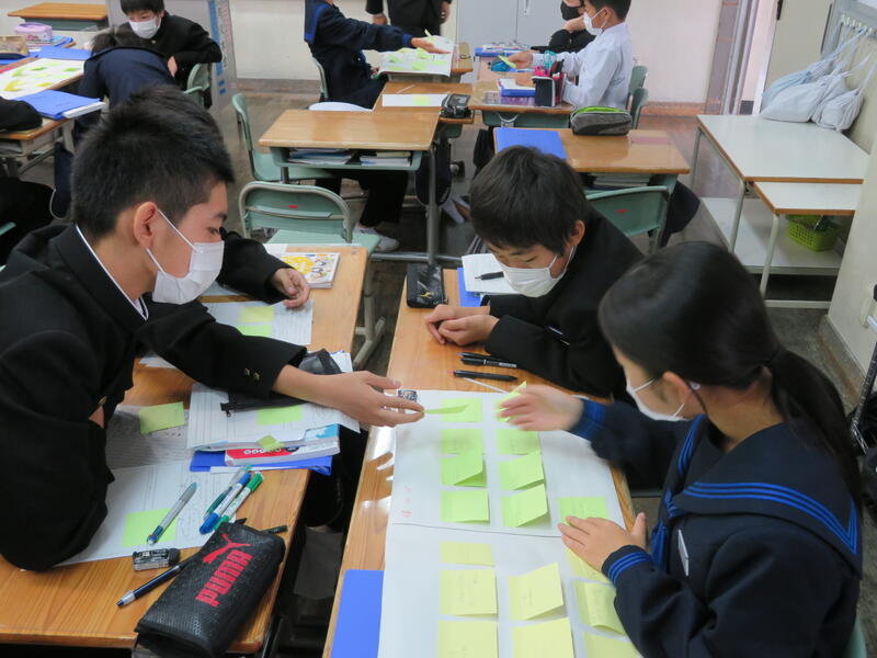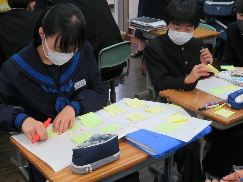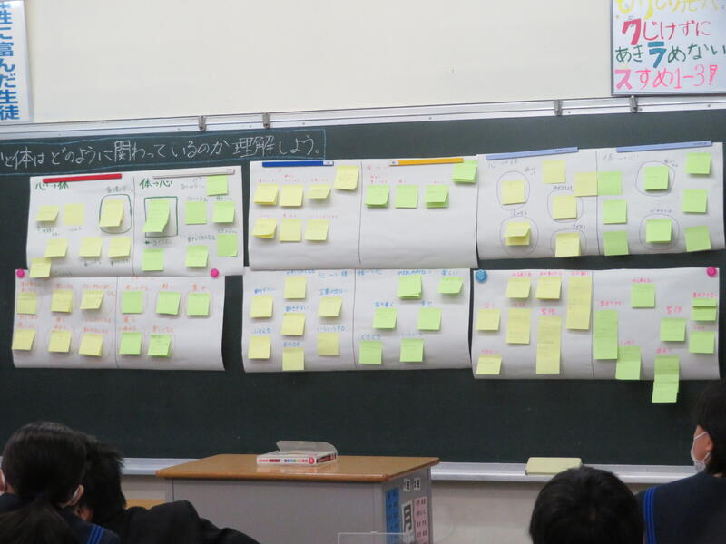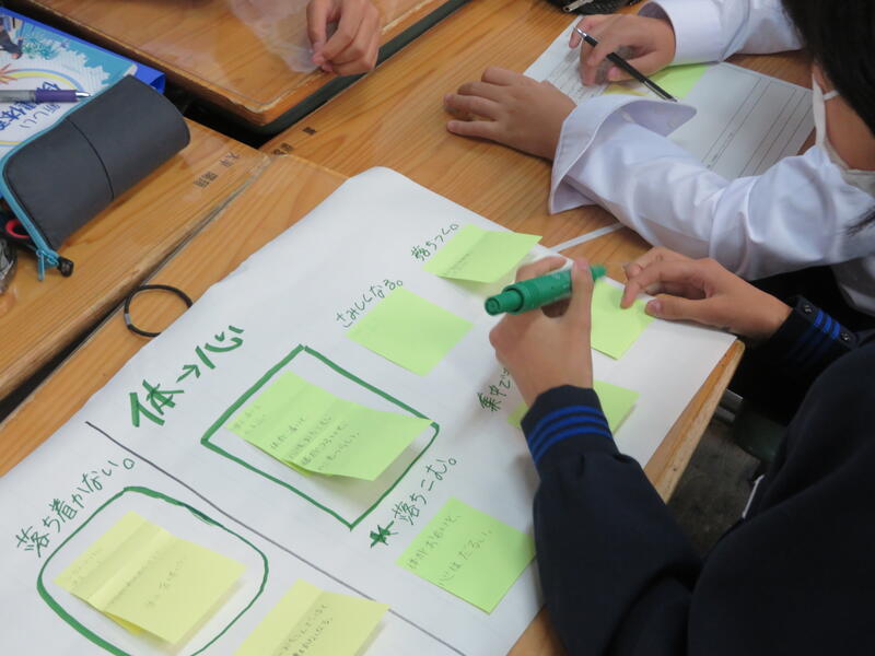 「心と体はどのように関わっているのか」という学習課題について話し合いが行われました。一人一人の考えをグループ内で共有し、整理していく、KJ法という活動です。