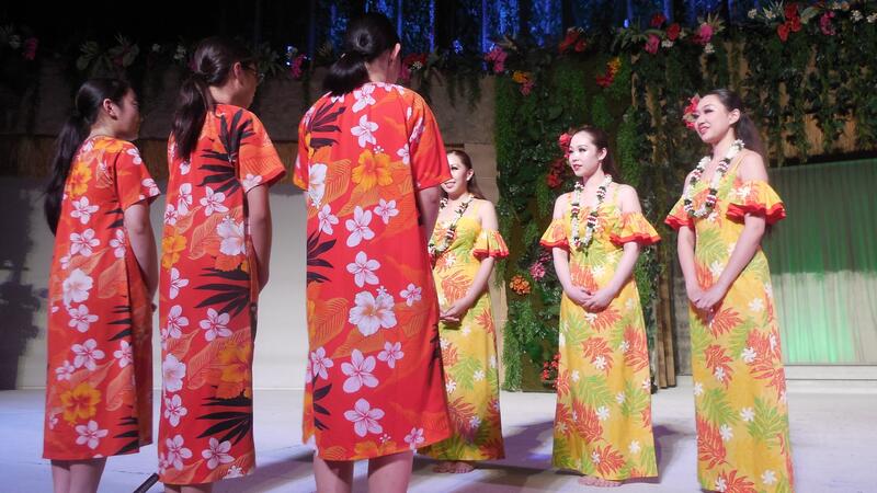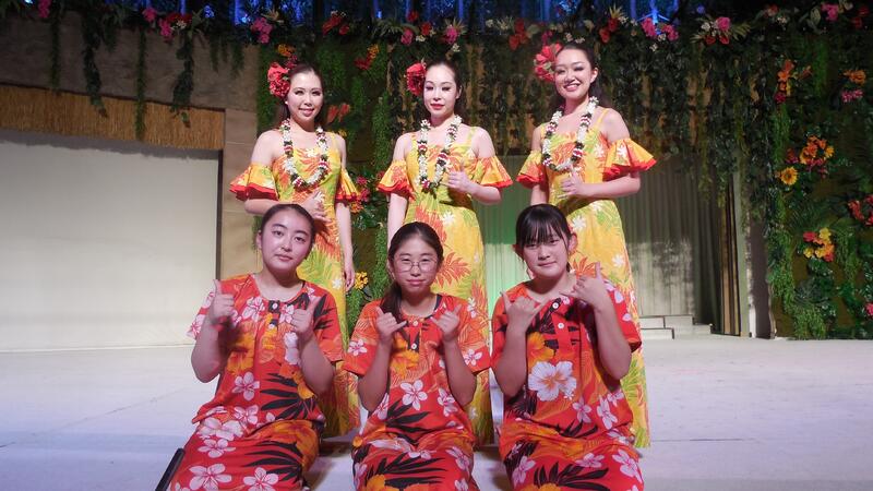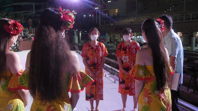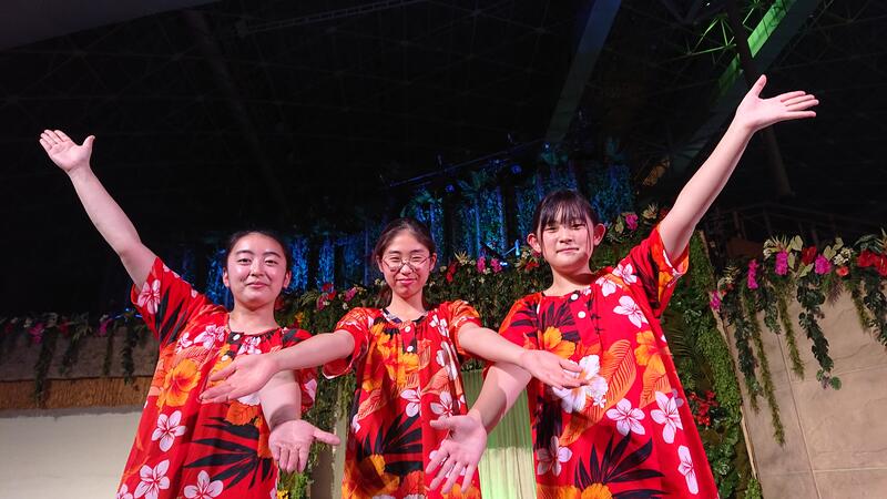夜のステージ開演前でたいへんお忙しい中にもかかわらず、ご出演いただいた3名のフラガールのみなさん、本当にありがとうございました!