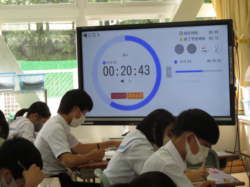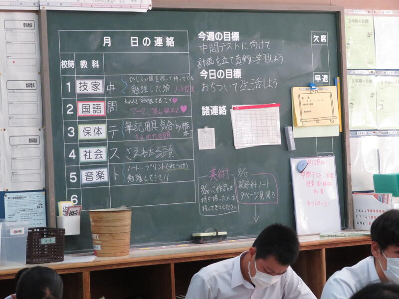 今日は1校時から、技術・家庭、国語、保健体育、社会、音楽のテストを行いました。明日は残りの3教科を行い、4校時からは通常の授業を行います。