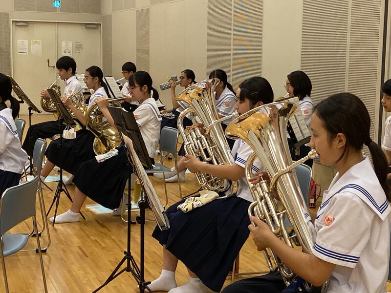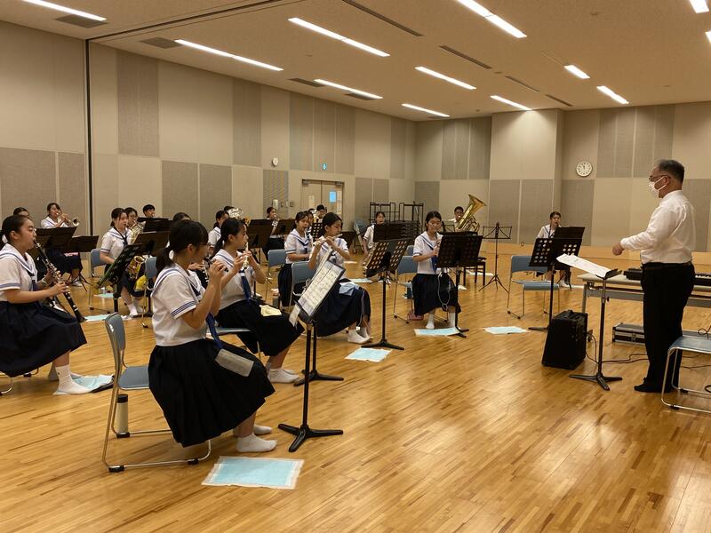 課題曲Ⅰ「トイズ・パレード」自由曲「シネマ・シメリック」支部大会よりもより磨き上げられたすばらしい演奏を大ホールいっぱいに響かせました。本日は、感染対策を十分に行い、出演生徒のご家族のみ、会場で鑑賞することができました。本番のホールでの撮影はできませんでしたので、リハーサル室での様子をアップします。
