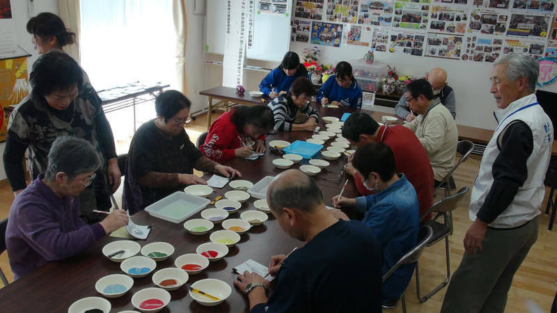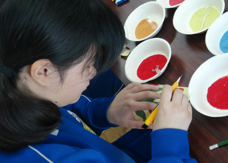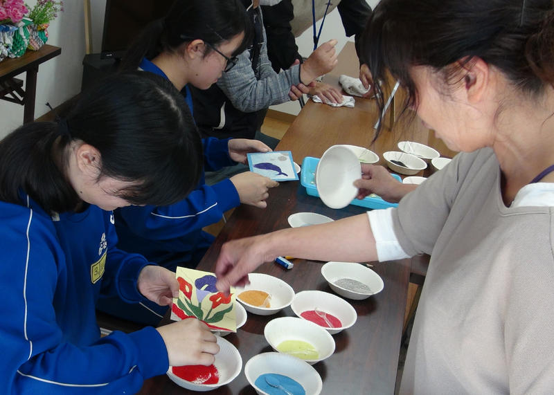 会場の準備が終わったら、砂絵づくりのスタートです。この日参加した2年生・3年生の生徒たち自身も、砂絵を作るのは初めて。NPO法人いわき鳴き砂を守る会のみなさんから助言を受けながら、台紙にデザインを描いて着色した砂で色をのせていきます。