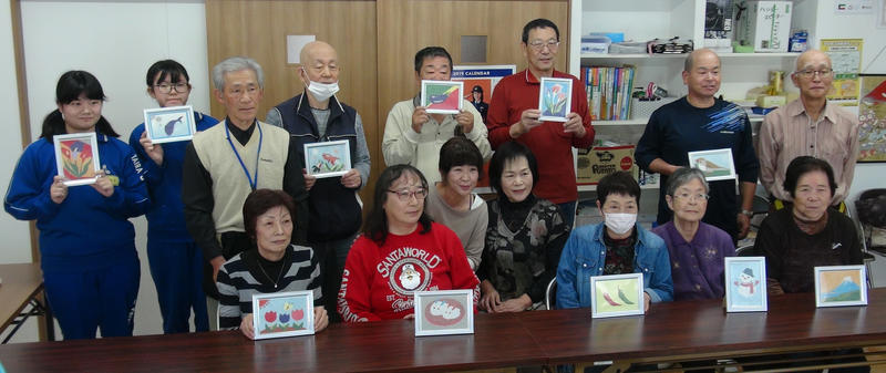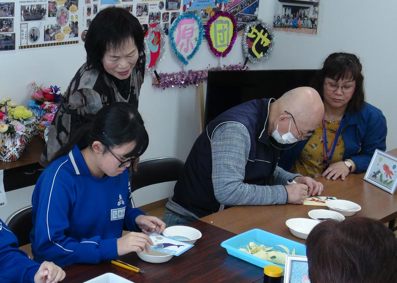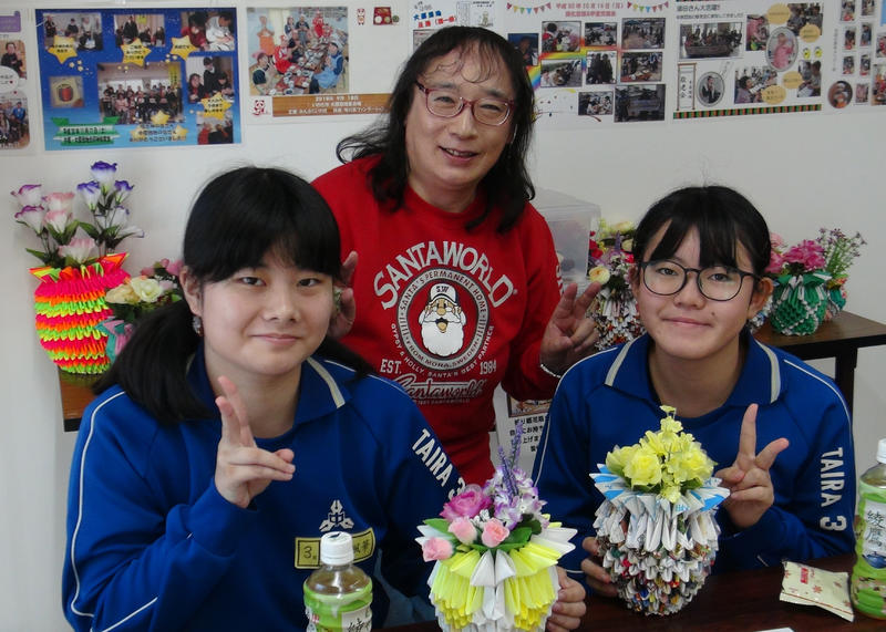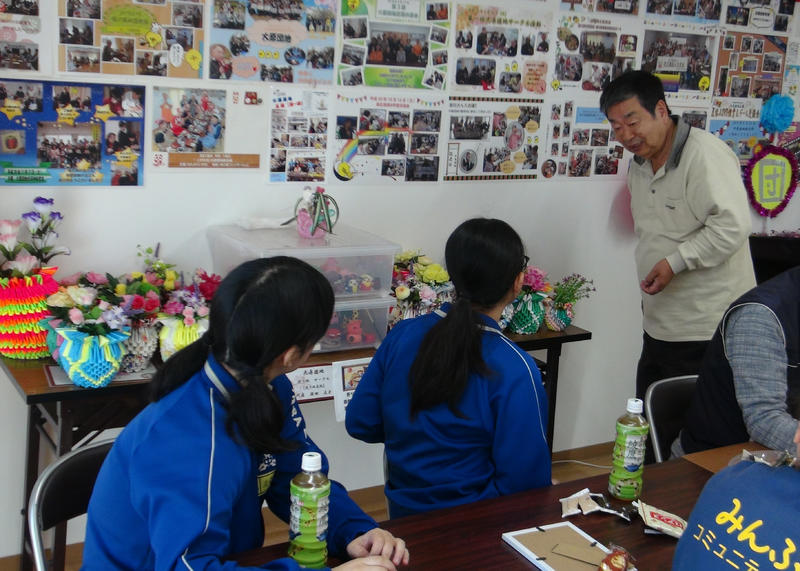 砂絵が完成したあとは、参加者みんなで楽しい一時を過ごしました。この日の感想を述べあったり学校生活などを紹介したりと、みなさんと活発にお話をしました。また、この日参加していた方が作った折り紙の花瓶をいただいて生徒たちは大喜び!いっしょに記念写真も撮らせていただきました。