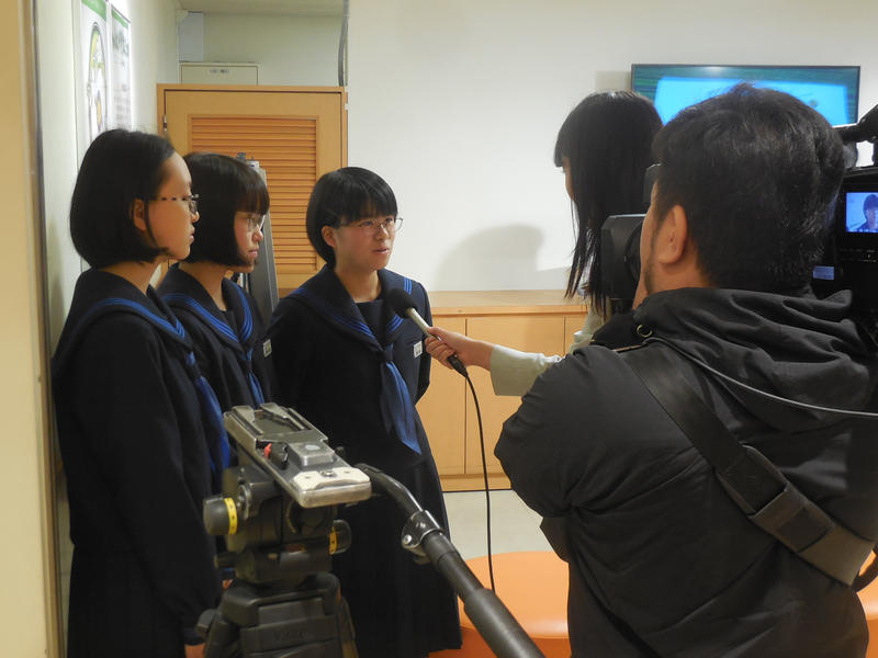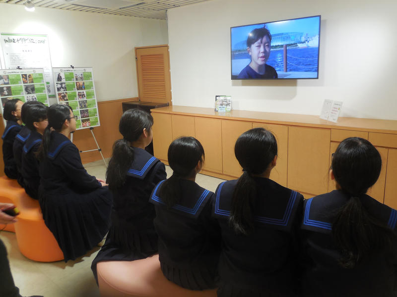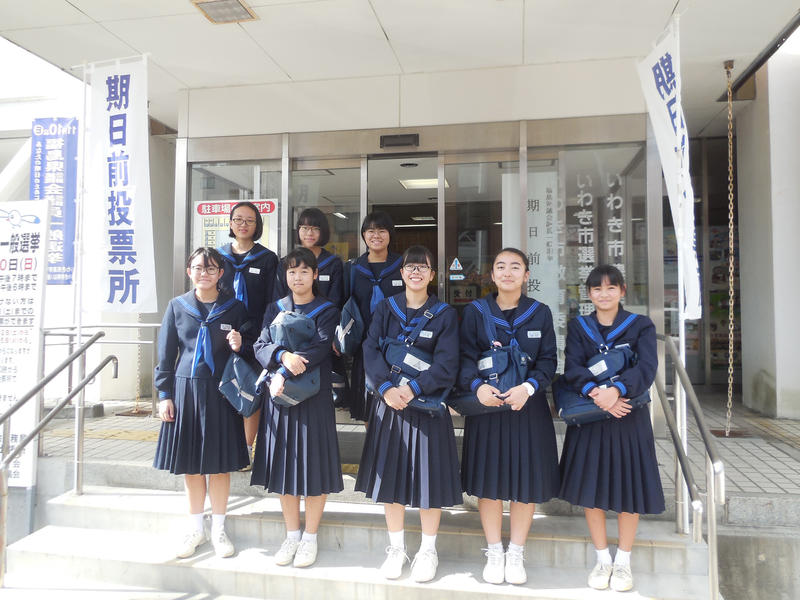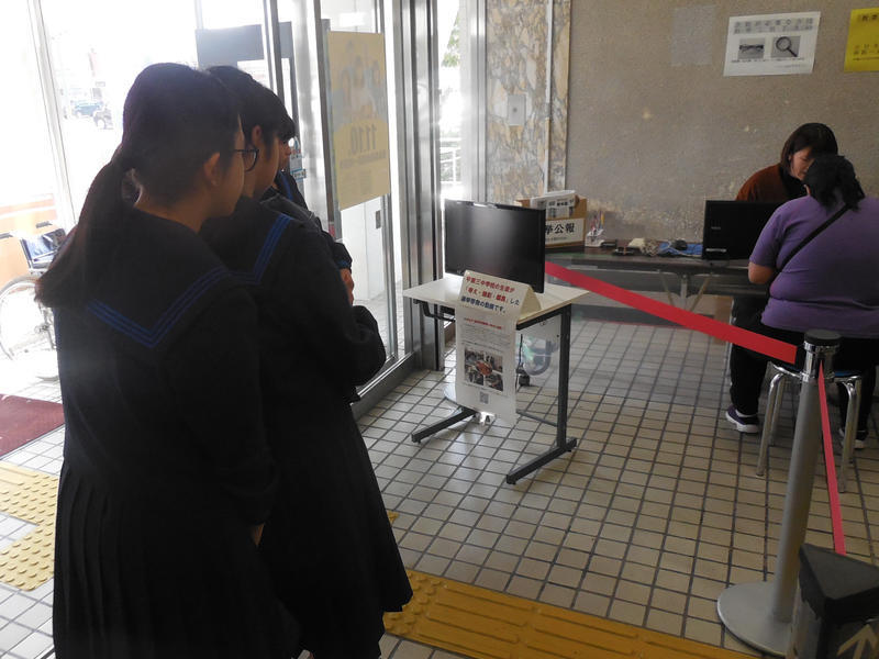 選挙権がない生徒たちのほとんどは、投票の様子を実際に見たことがないということで、いわき市役所東分庁舎で行われている期日前投票の様子を見学に行きました。ここでも自分たちが制作した動画がエンドレスで流れていて大感激です。