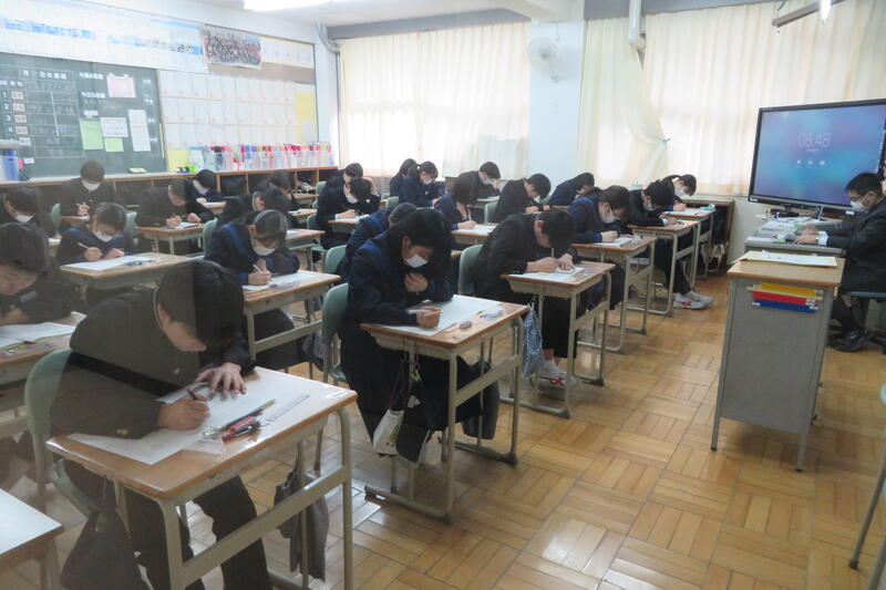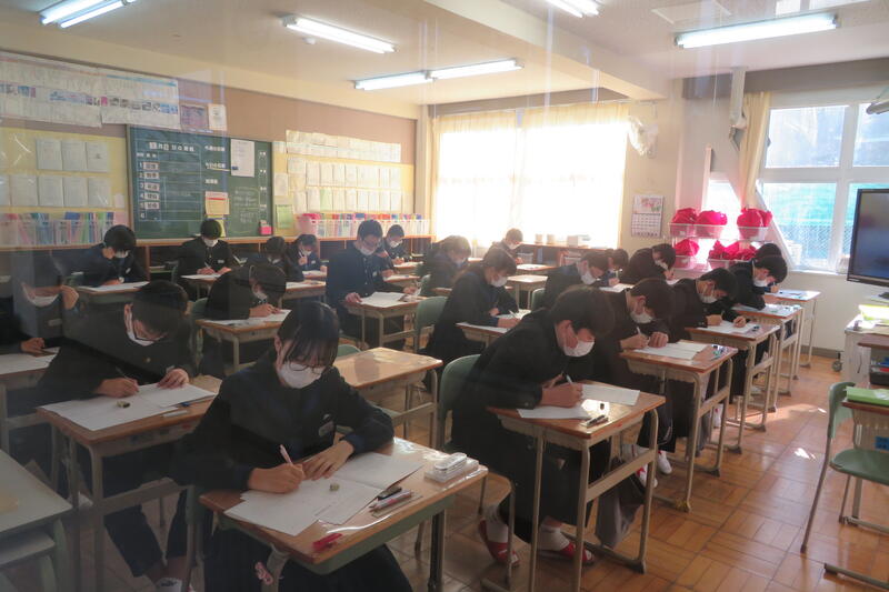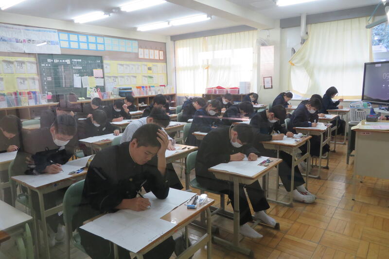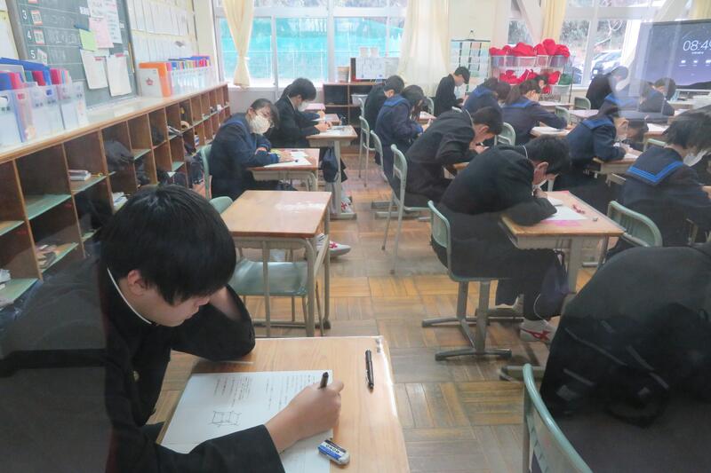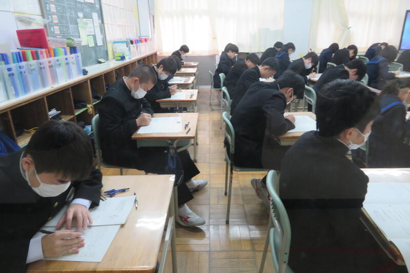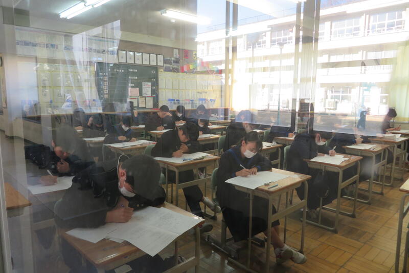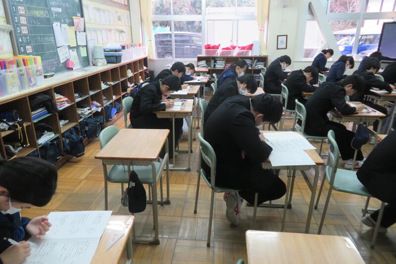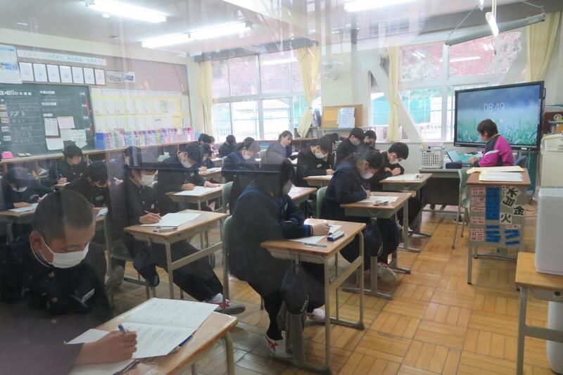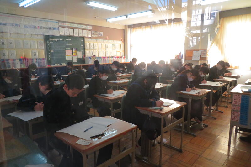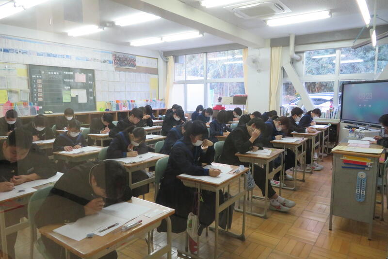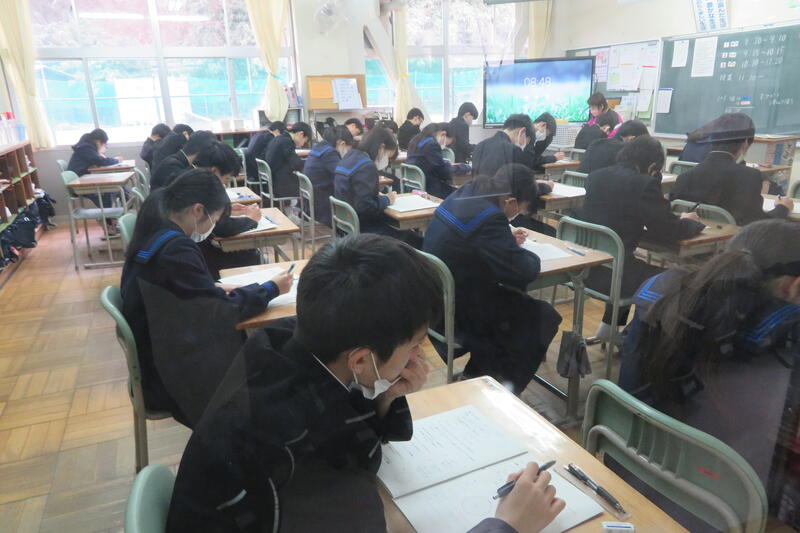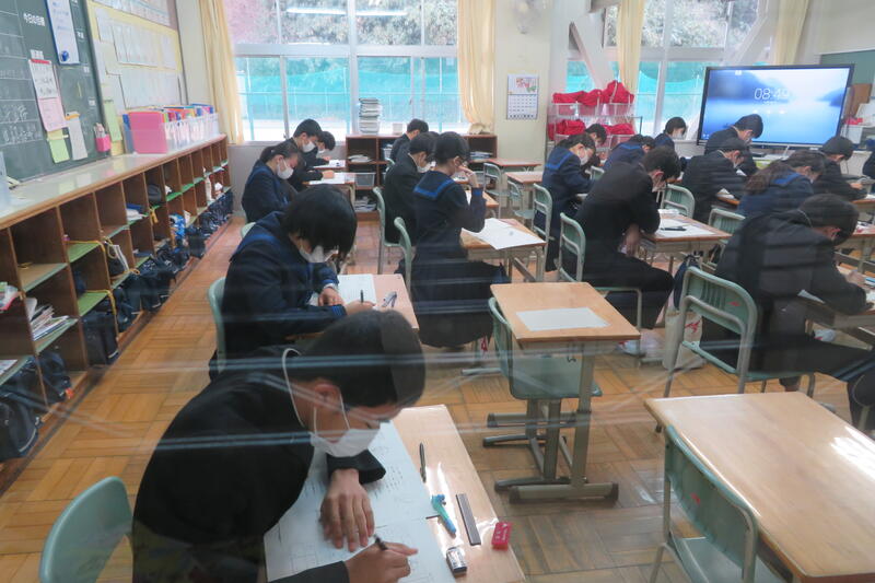昨日は、3年生の学年末テスト1日目と1・2年生の学力テストが行われ、今日は3年生の学年末テスト2日目(数学、社会、英語)が行われています。