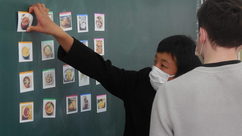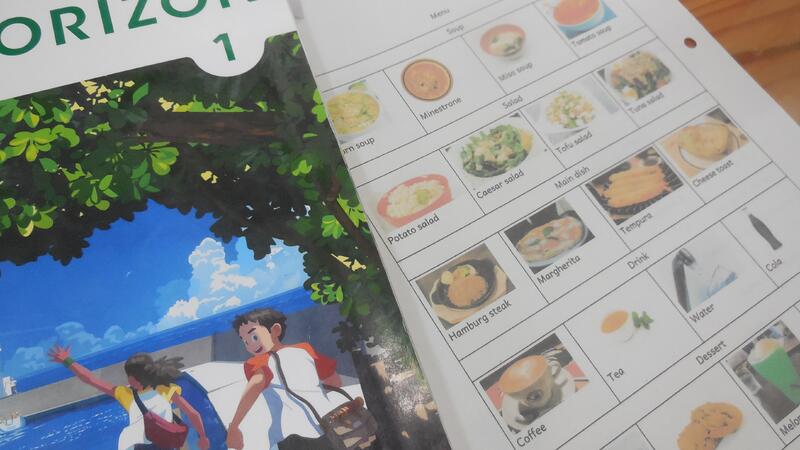 とはいっても、教科書と同じ文章では面白味がありません。メニューを増やし、デザートも追加して…ジェイムズ先生が平三中1年生のレベルに合った会話内容を考えてくれました。