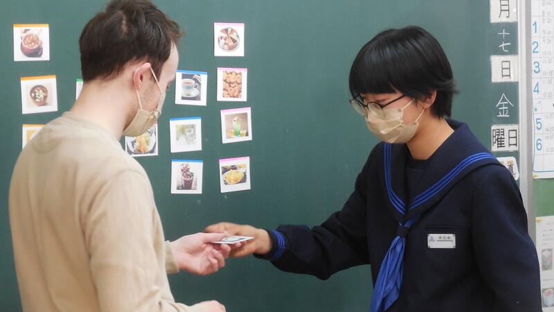 ひとりひとり黒板にやってきて、ジェイムズ先生と会話をします。予想外の注文も何のその。店員さんとしての役割をみんなしっかりとこなしています。