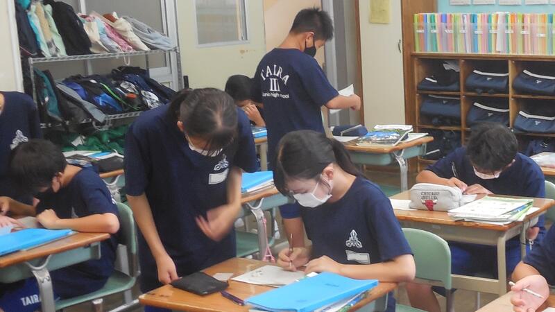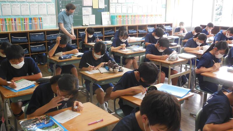 中間テストまであと5日。朝や昼休みも生徒たちは学習に取り組んでいます。もちろん授業でもテスト範囲の見直しを行っていますが、1年生の英語の授業では、ジェシカ先生と楽しみながら既習の学習事項の確認を行いました。