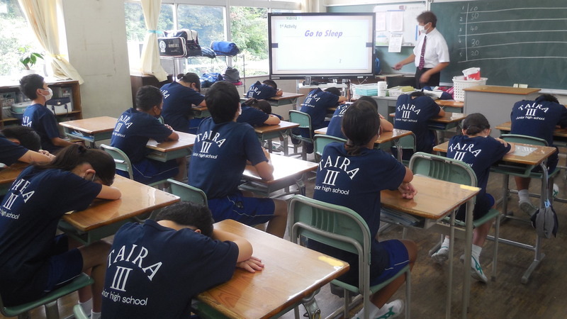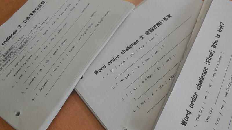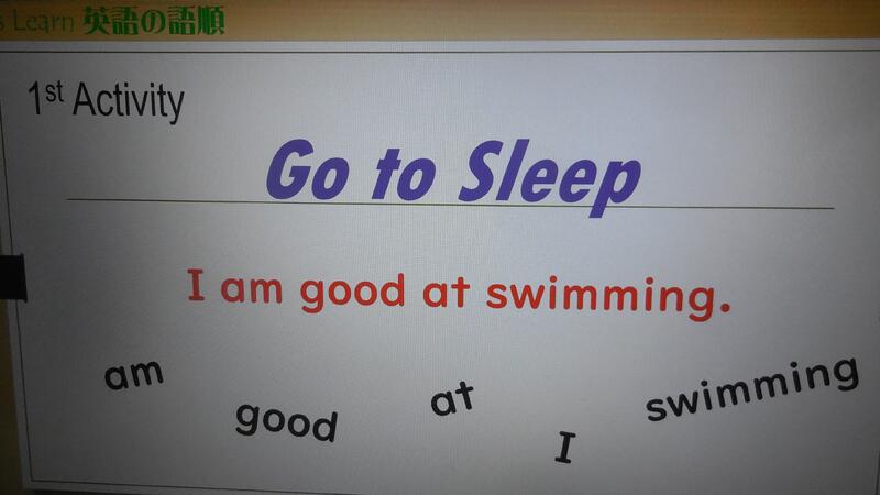 まずは、日頃の疲れを考慮して教室で居眠り…というわけではありません。英単語を並べかえて英文を作る活動です。名付けて【Go to Sleep】。[主語+動詞+説明…]という語順は日本語とは異なるため理解するのが難しいのですが、この語順を身につければ聞き取りも読み取りも話すのも楽になります。そこで、5人の生徒が1単語ずつ覚えて、みんなで相談して正しい英文を完成させます。