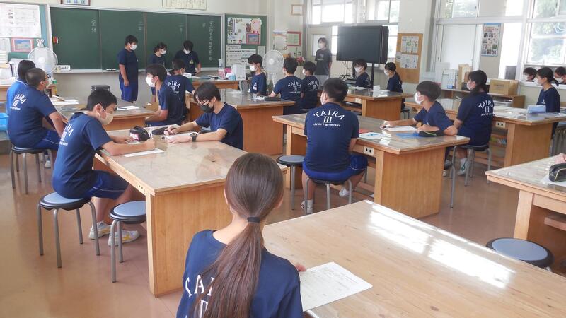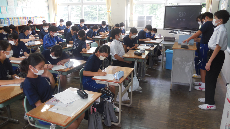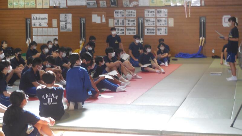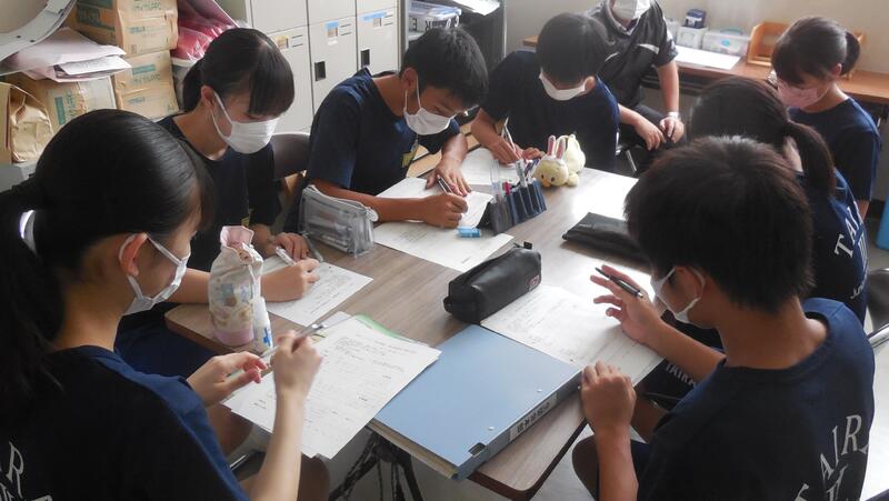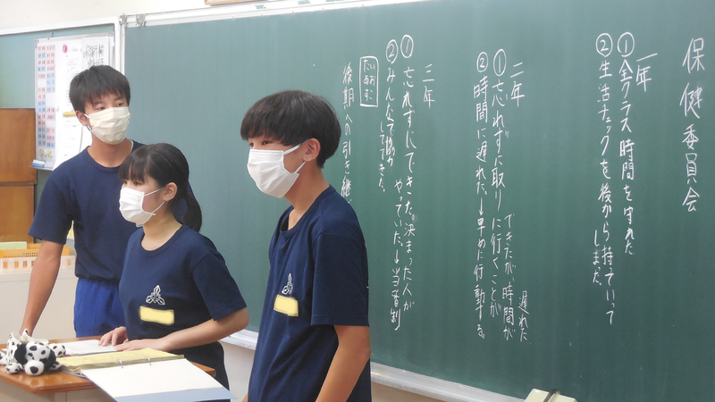 感染症対策のためにクラスの代表生徒のみが参加して行われることもありますが、今回は前期最後の反省ということで、全員が各場所に集まっての会合です。リーダーとして集団をまとめてきた3年生はもちろん、新人チームなどで活動の中心的役割を果たしている2年生、学校生活にも慣れて積極的に活動を行っている1年生が、それぞれの立場で活動の反省をまとめたり後期への申し送り事項について話し合いを行いました。