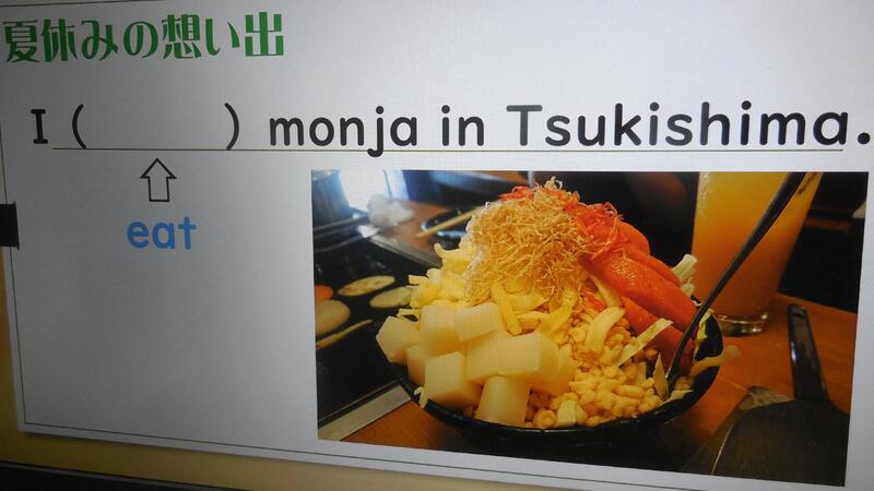 夏休みの想い出を完成させる活動では、写真を見て旅行中の出来事を英語で表現しました。もんじゃ焼きの定番[明太もちチーズ]の写真のキャプション "I ( ) monja in Tsukishima." …さて、( ) に入る動詞の過去形は何? ボタンを押す手にも力が入ります。