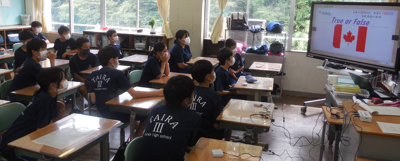 いよいよ今週の水曜日・木曜日に行われる中間テスト。 1年生の英語の授業では、ALTのジェシカ先生といっしょに表現活動を通してテスト範囲の見直しを行いました。最後に行ったのは【True or False】。英語の授業では定番の活動で、ジェシカ先生が言う英文を聞き取って、その内容が正しいかどうかを判断します。 "I went to Canada this summer." …コロナ禍で渡航制限もある中、果たしてジェシカ先生は里帰りできたのか?生徒たちは悩みながらもTかFかを選択して答えていきます。