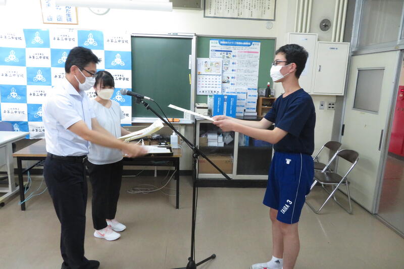 続いて登場したのは、現在放送常任委員長として活躍している3年生。入学時からずっと放送活動に関わり、合唱コンクールの進行や様々なイベントでのMCやインタビュアーとして活躍しています。 NHK全国中学校放送コンテストで「優良賞」を受賞したラジオ番組「季節を感じて」とテレビ番組「マスクに自由を」の概要や、制作時に苦労した点、伝えたかったことなどを紹介してくれました。