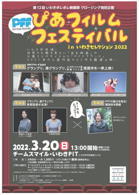ぴあフィルムフェスティバルは、映画の新しい才能の発見と育成をテーマに1977年にスタートしたもので、自主映画の公募や上映を行っています。今回は第12回いわきポレポレ映画祭2022のクロージング特別企画として、いわきで初開催される運びとなりました。新進気鋭の映像監督が制作した作品、そして進行を務める平三中の生徒たちの活躍をどうぞお楽しみに!