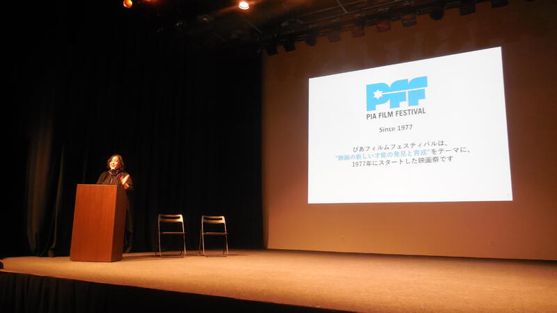 そして午後1時になり、映画ファンがたくさん詰めかけた会場でいよいよイベント開始。まずはぴあフィルムフェスティバルの総合ディレクターを務める荒木啓子さんの講演です。「PFFは映画監督を夢見た二十才の若者たちが始めた映画祭です」と題された講演は、1977年のスタート当初の様子から今後の展望まで、ずっと中心にいた方ならではの貴重なお話ばかりで、あっという間に時間が過ぎた60分でした。