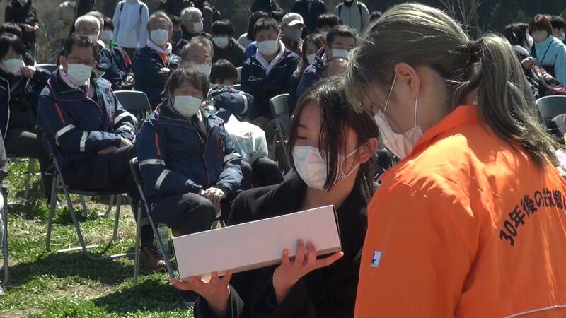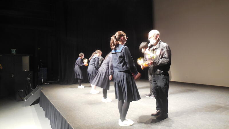 最後にエンタテインメント賞と映画ファン賞を受賞した『愛ちゃん物語♡』の上映ですべてのプログラムが終了しましたが、エンディング後にいわきPITを運営してきたチームスマイルのみなさんが登壇。2015年にオープンしたいわきPITは、「こころの復興」と「支援・活動の継続性」を目的に設立されたものですが、運営を行ってきたチームスマイルとしての活動は3月末で終了となります。震災以来「つなげよう、感動。つながろう、東北の笑顔」をスローガンにいわきで様々な活動を企画・運営してきたチームスマイルみなさんに、平三中の生徒たちから花束を贈呈させていただきました。みなさん、本当にありがとうございました!