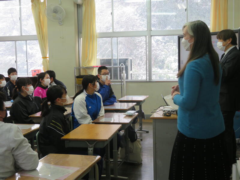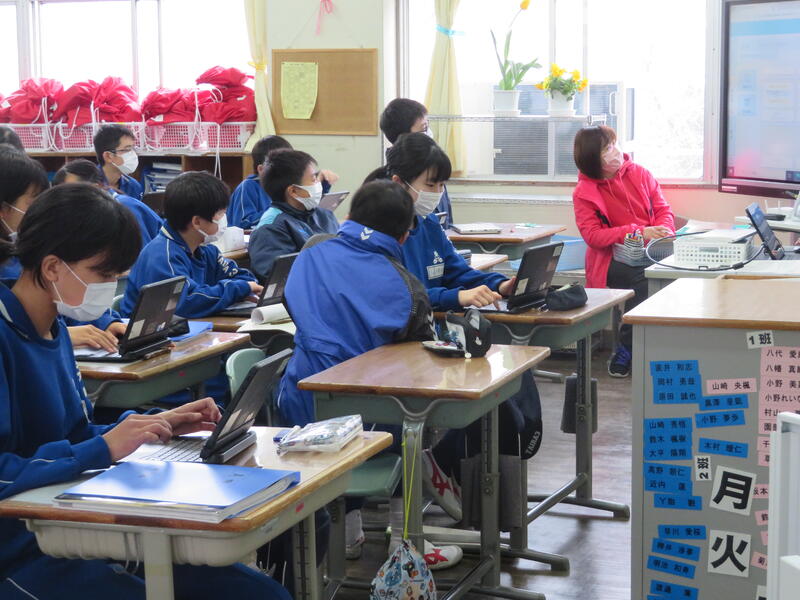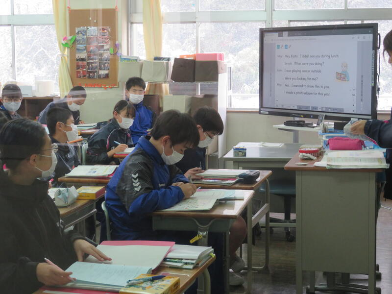 明日は修了式。今日は令和3年度最後の教科の授業が行われました。ALTとの授業も今日が最後です。
