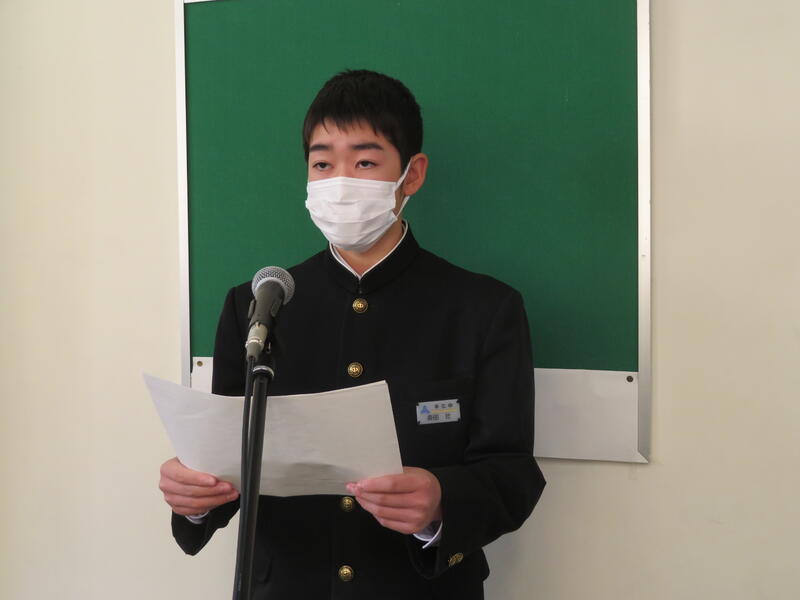 新型コロナウイルスの影響により様々な制限がありましたが、学校生活を充実したものにできたと思います。その理由の一つは、体育祭、合唱コンクール、遠足などの学校行事が様々な工夫をして行われ、楽しく充実していたからです。また、3年生が引退していた部活動では、チームを背負う責任と難しさを感じながら、それを乗り越えようと頑張ってきました。そういった活動も、学校生活をより充実したものにしてくれました。