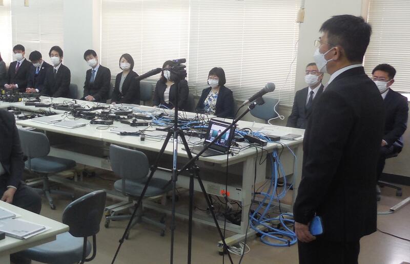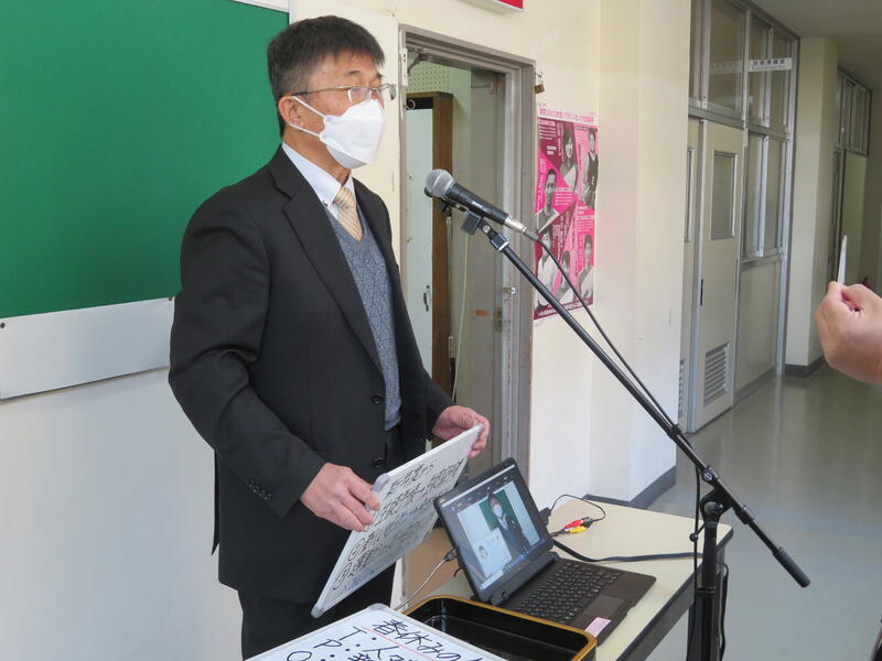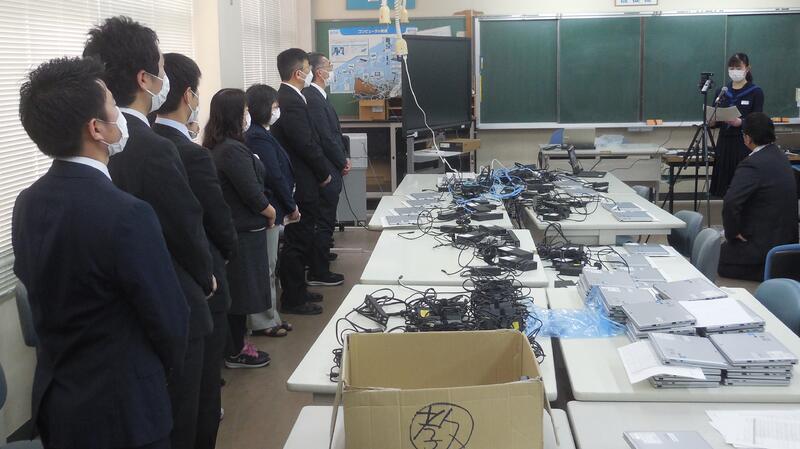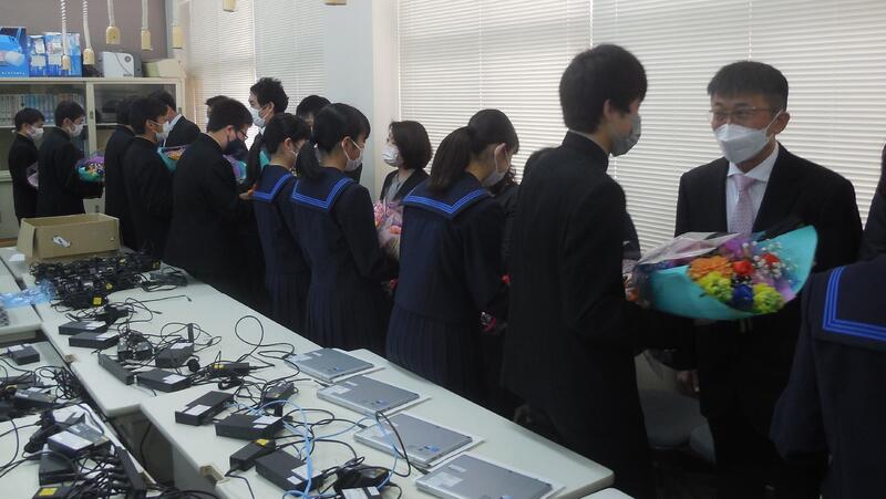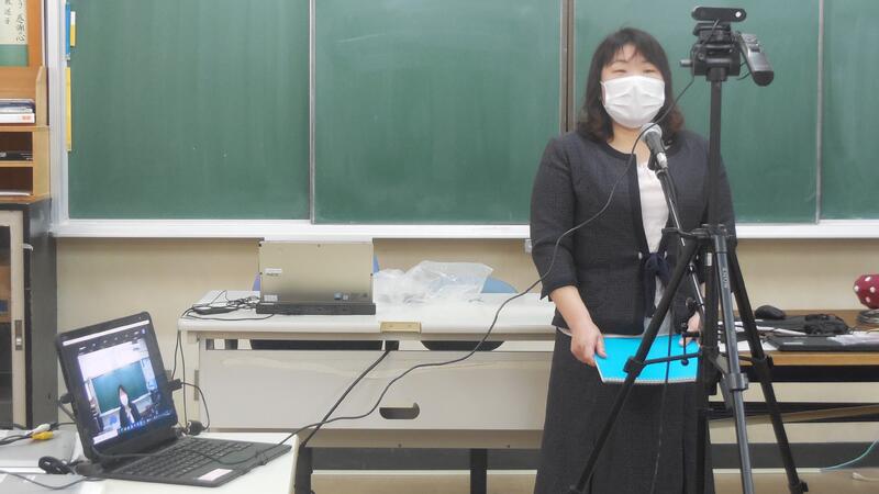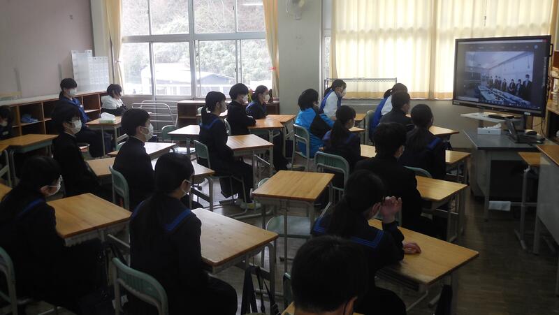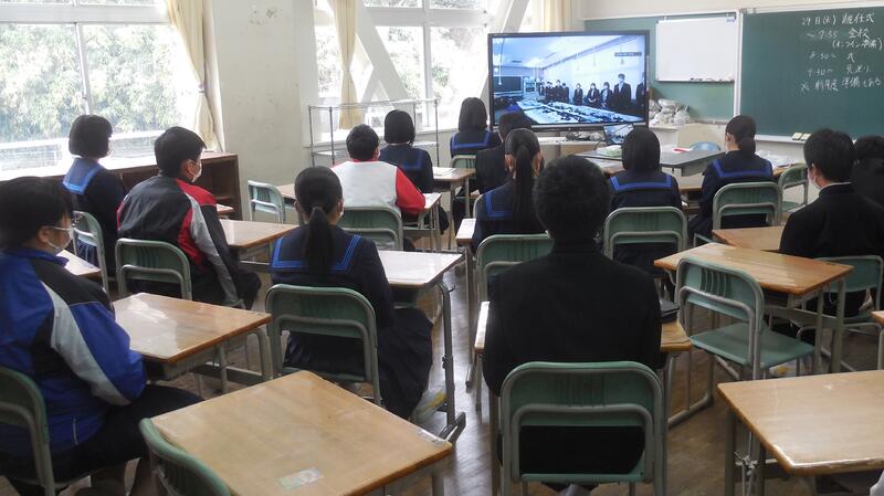 感染症拡大防止の観点から、コンピュータ室で行っている式を1・2年生そして3月11日に卒業した生徒たちはそれぞれ自分たちの教室で見守りました。