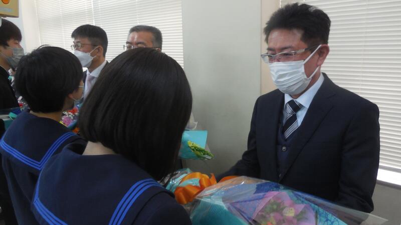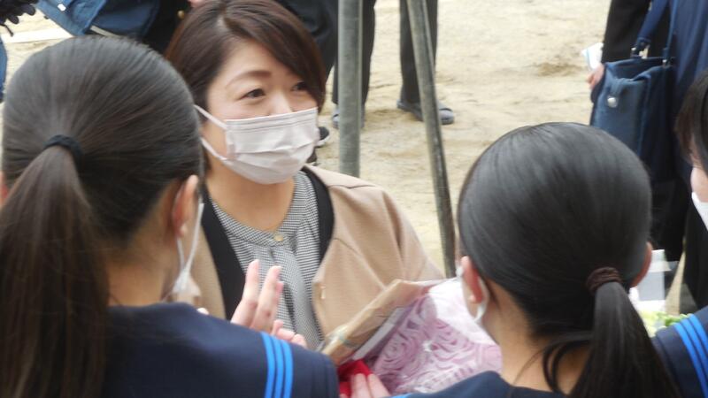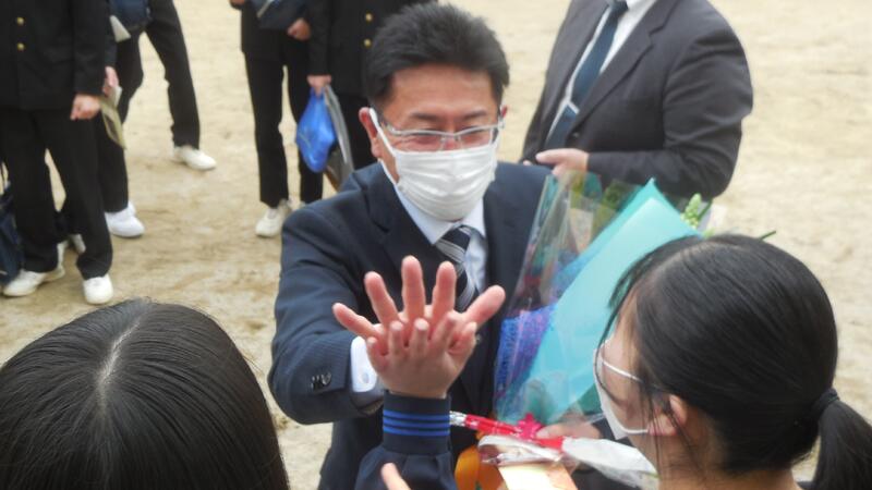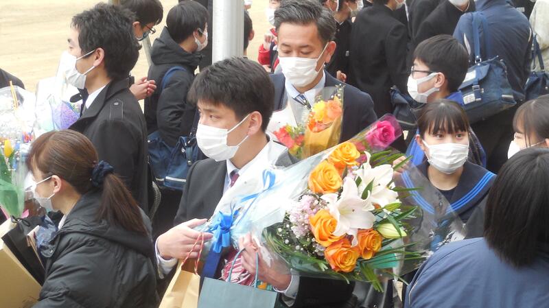 そして、授業や部活動などでお世話になった先生に、それぞれゆかりのある生徒たちが花束を贈呈しました。短い会話でしたが、今までの思いが溢れ涙がこぼれました。