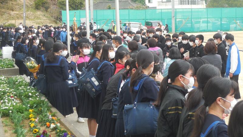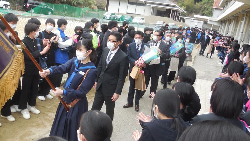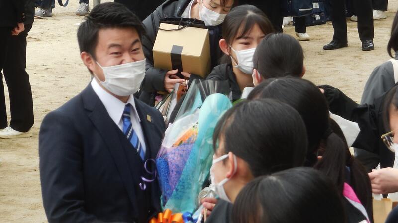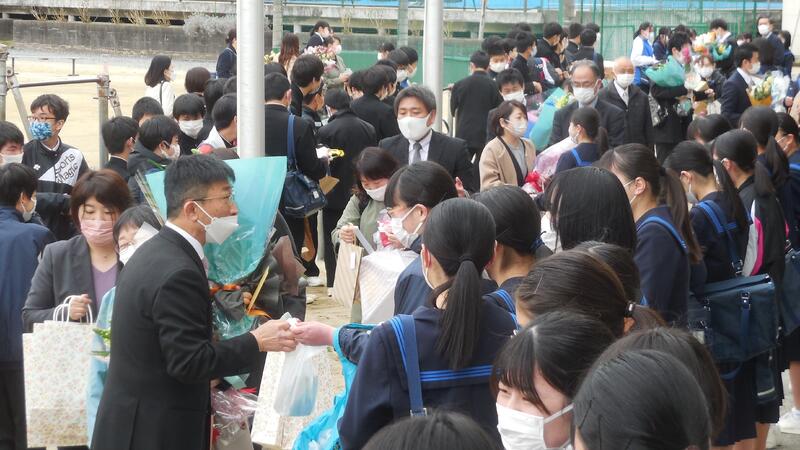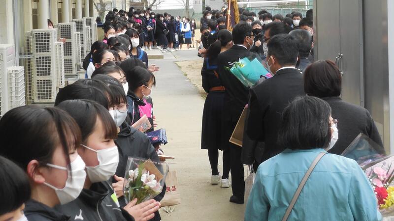 一昨年は離任式そのものが実施されず、昨年も放送でお別れの言葉を聞いただけでしたが、今年は3年ぶりに離任式後の見送りが実現しました。在校生はもちろん、今年の卒業生や過年度の卒業生、そして保護者のみなさんが転退職される先生方に最後のお別れをするために足を運んでくれました。