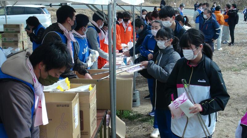 さくら広場に戻ると、ご当地グルメのなみえ焼きそばをはじめ、ポテトや唐揚げ、大判焼きなどが用意されていて、参加者の空腹を満たしてくれました。さらにこれで終わりではありません。最後には抽選会が行われ、近隣市町村から提供されたグッズや名産品などが参加者にプレゼントされました。平三中の生徒からも当選者が続き、中にはハワイアンズの招待券をゲットした生徒も…おめでとうございます!