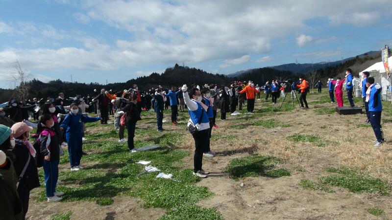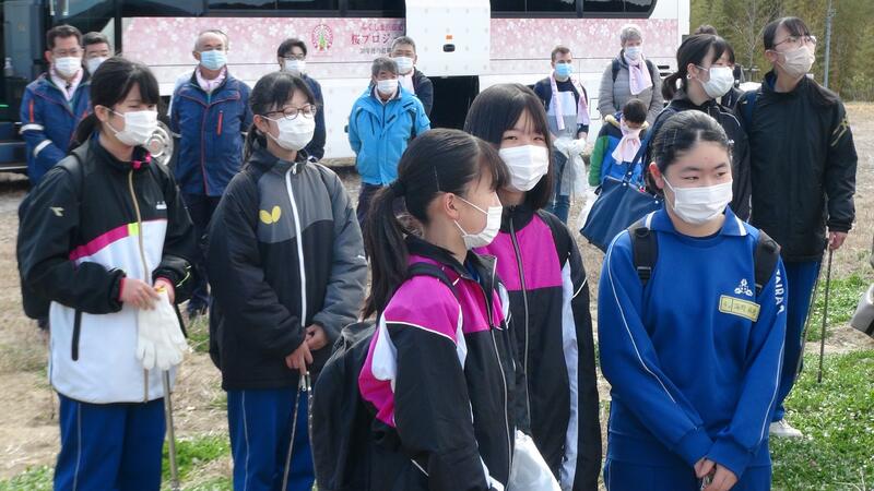 集合場所は広野IC近くのさくら公園。3月中旬に参加を呼びかけたところ、新2・3年生はもちろん3月に卒業した生徒、さらには保護者の方々も活動の趣旨に賛同して、合計20名ものみなさんが申し込みをしてくれました。受付を済ませて開会式、ラジオ体操が終わると、いよいよバスで楢葉町へと移動して活動開始です。