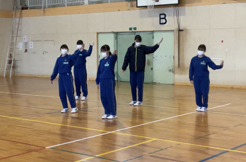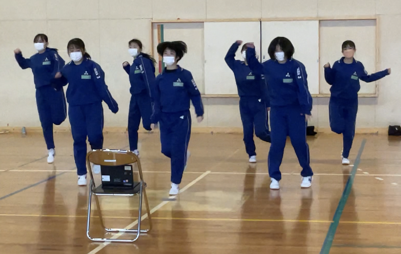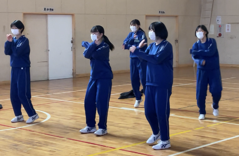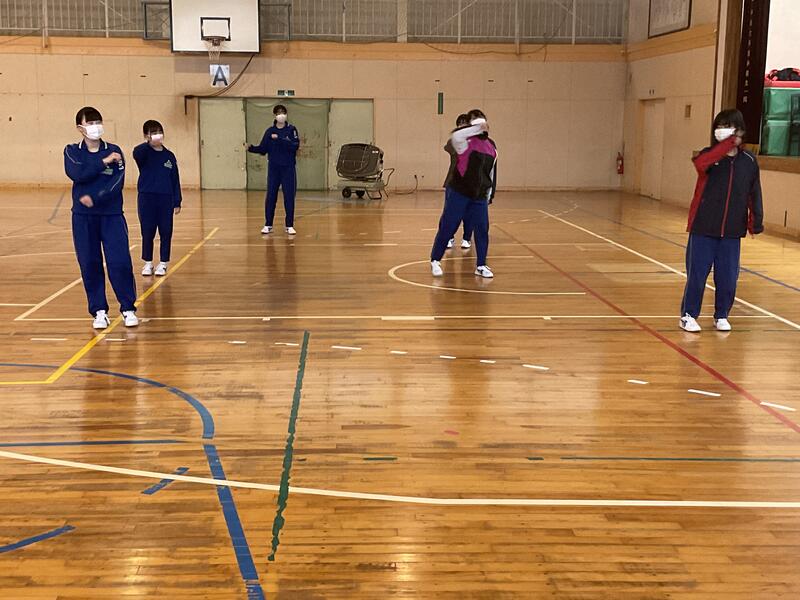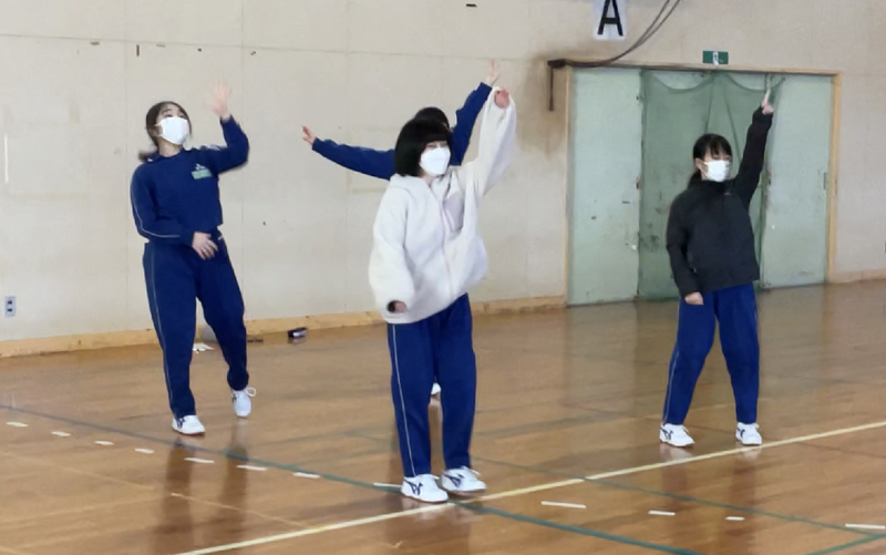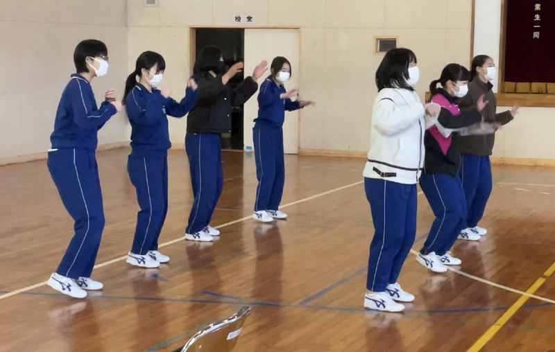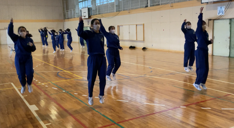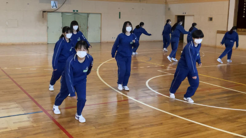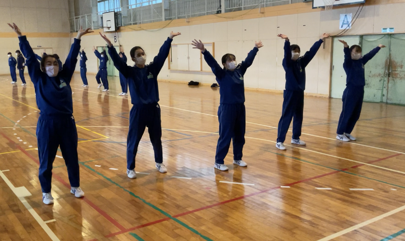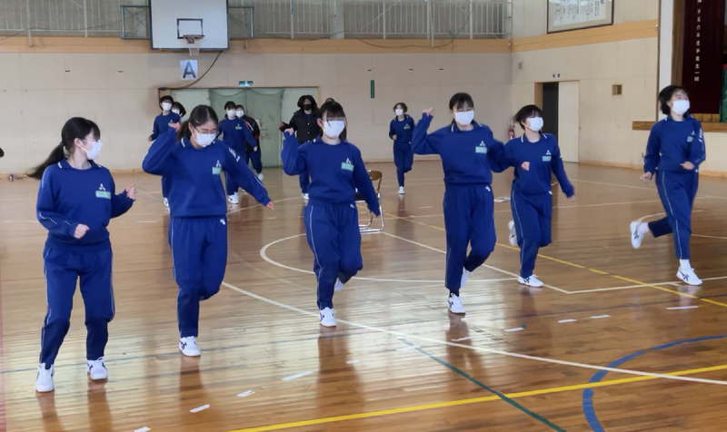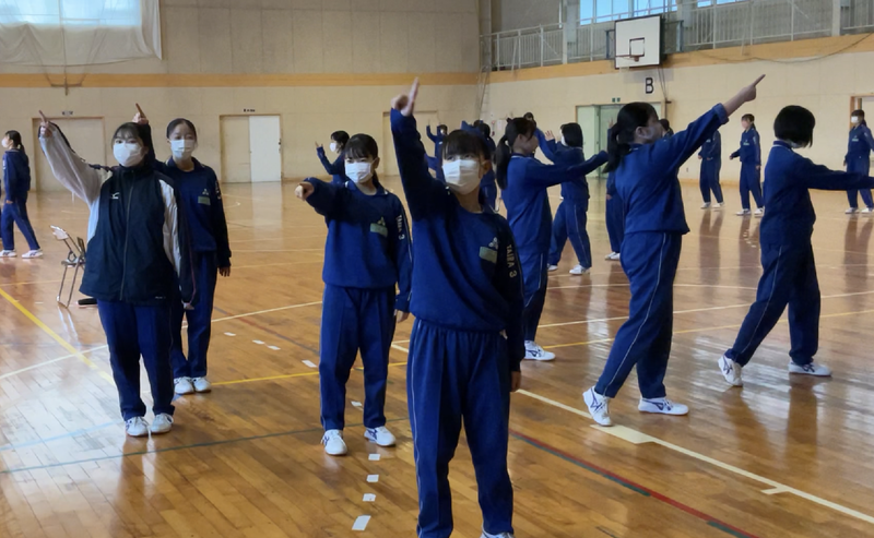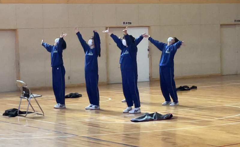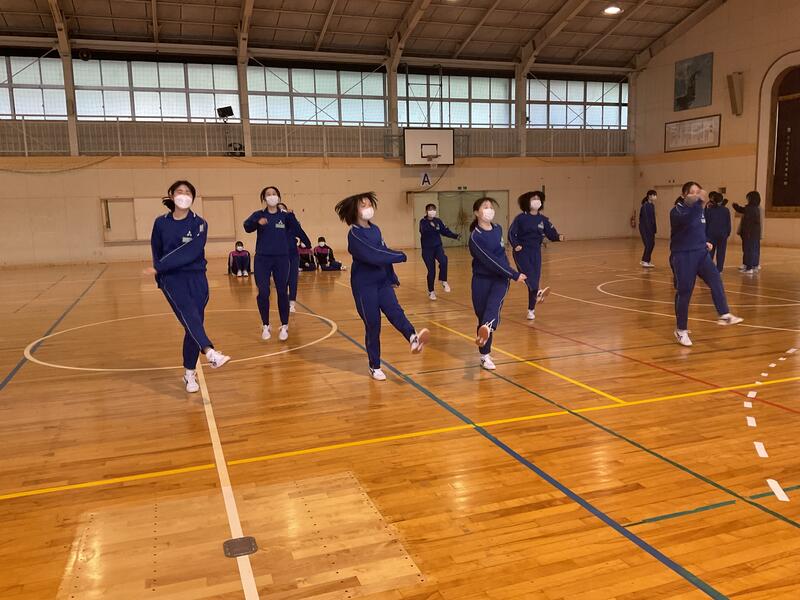 3年生女子は、ダンスの授業でグループごとの創作活動に取り組んできました。「群青」という曲の歌詞に込められた思いを読み解き、身体表現するという難しい課題です。曲の後半はすべてのグループが共通の振りつけで踊ります。