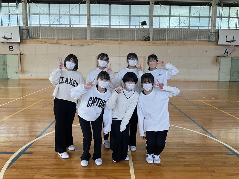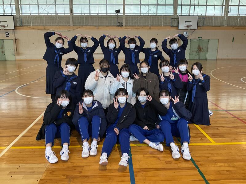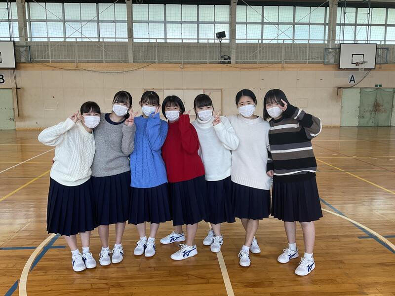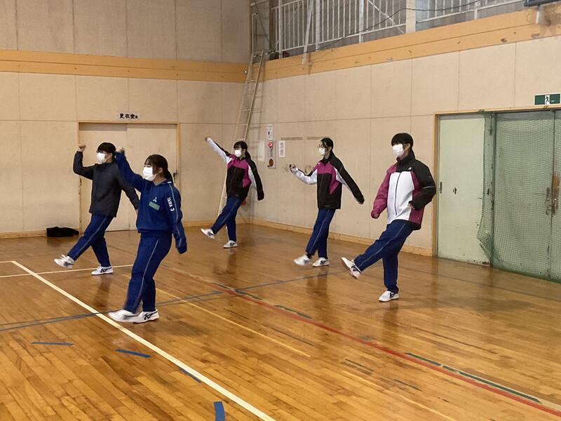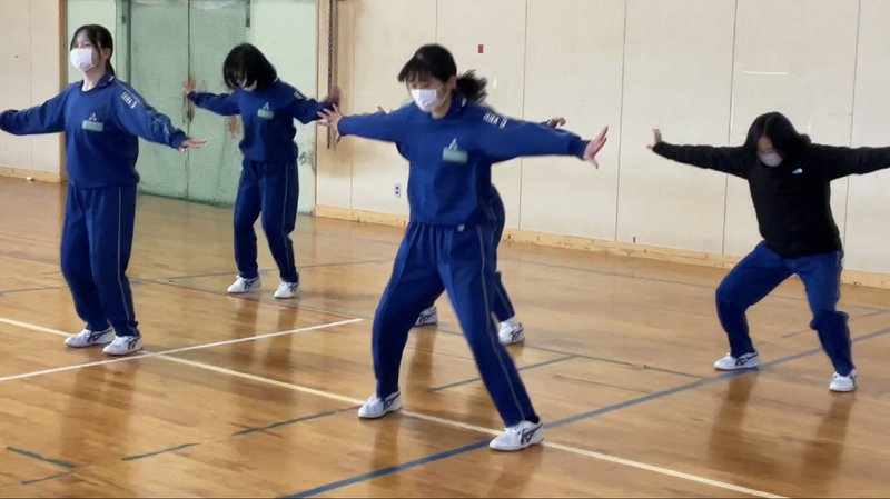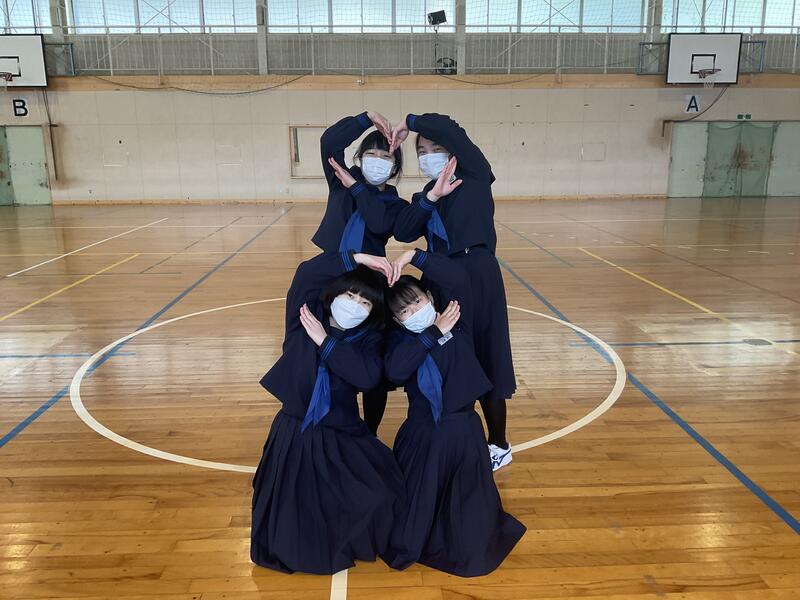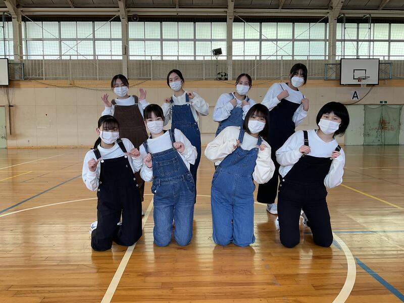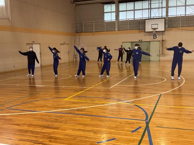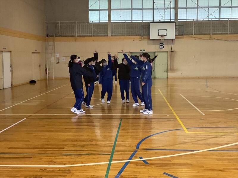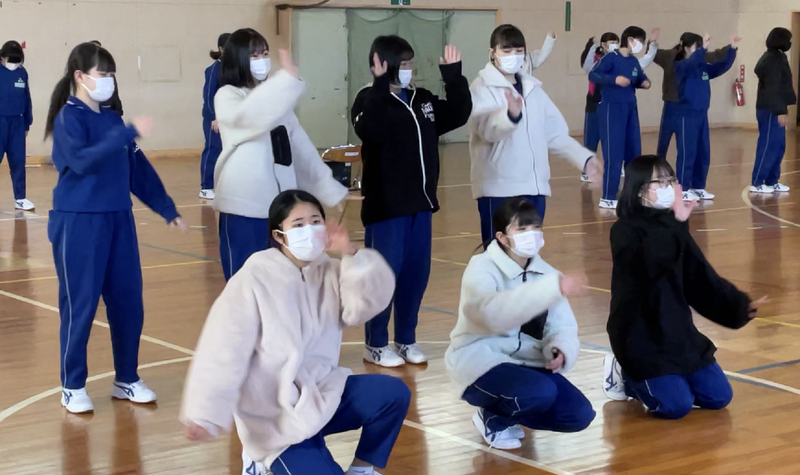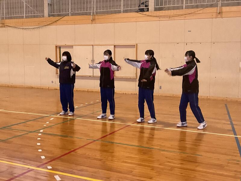 3年生女子は、ダンスの授業でグループごとの創作活動に取り組んできました。「群青」という曲の歌詞に込められた思いを読み解き、身体表現するという難しい課題です。曲の後半はすべてのグループが共通の振りつけで踊ります。