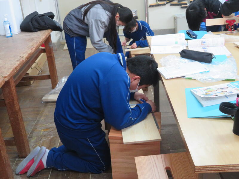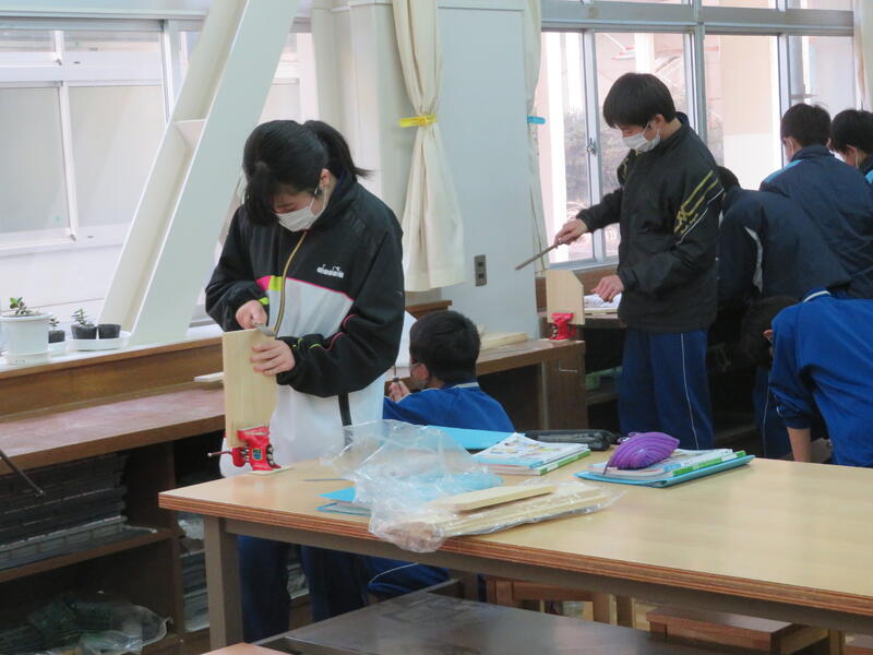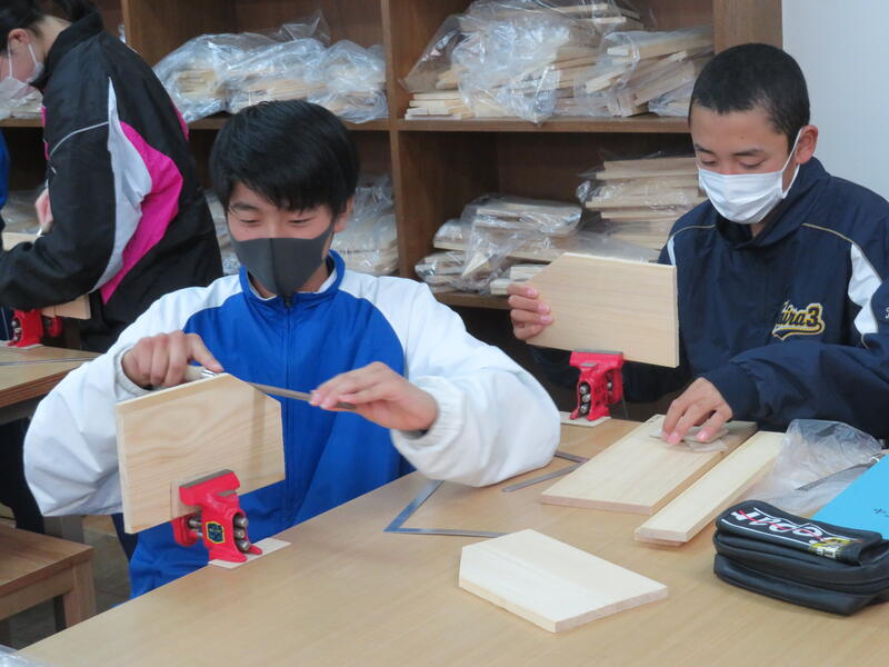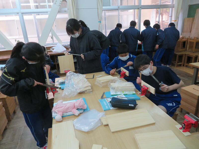 技術・家庭科では、1年生が木材加工の実習に奮闘中です。