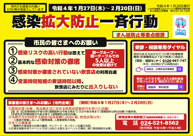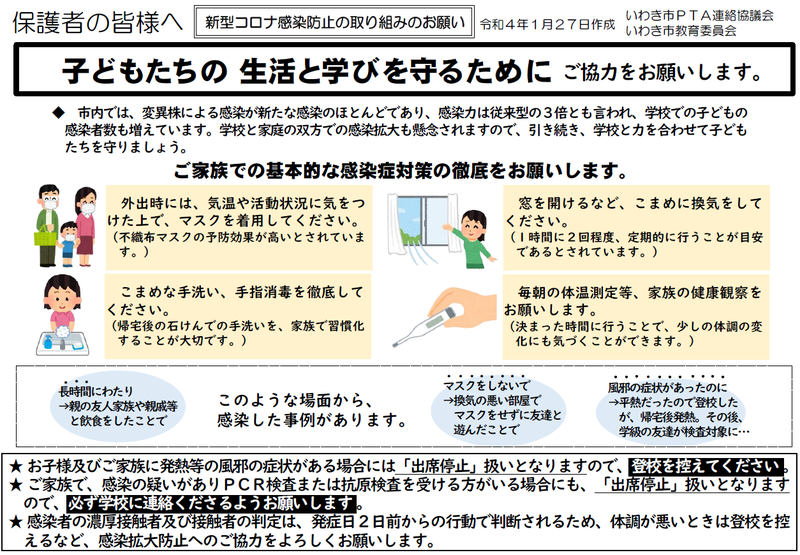 1月27日(木)から2月20日(日)までの期間、本市に「まん延防止等重点措置」が適用されました。これに伴い、いわき市PTA連絡協議会・いわき市教育委員会から「保護者の皆様へ」の文書と、いわき市「感染拡大防止一斉行動」のパンフレットが送付されました。
